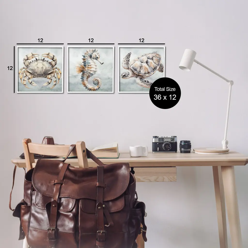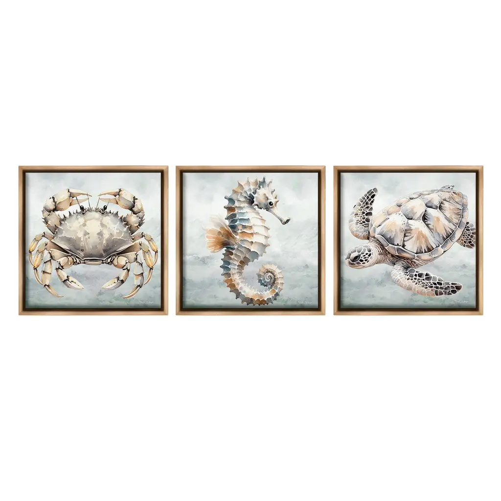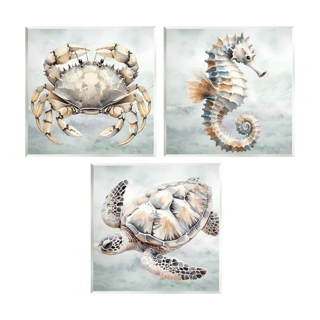 Fill any space in your home or office with our Framed Wall Art Sets. Our framed artwork is securely mounted into a 1.5-inch thick wood grain frame and ready to hang. Frames are available in three alluring styles: black, gray farmhouse and white. Stupell Wall Art is made in the USA.Features: Dimensions: 3 Piece Set, Each Panel is 12 x 1.5 x 12 FramedThree Piece Framed Giclee Sets are available as 12"x12" or 17"x17" Panels. All Framed Giclee Products have a 1.5" Depth.Wall Art is Ready to Hang with Hardware Free Hanging. No installation required. For Easy Set Up Lean or Layer Artwork on Shelf or Against Wall.Curated Wall Art Sets make it easy for you complete the theme for any room. Our giclée prints are carefully mounted on a durable MDF backing, and then perfectly finished in a 1.5 inch thick woodgrain frame. Mounted frame colors include black, gray farmhouse and white. Made In USA.Artwork Relates To: Seafood, Animal, Crab, Invertebrate, Sea Life, Lobster, Nautical, Maritime, Seahorse, TurtleDesign by Nicole Decamp