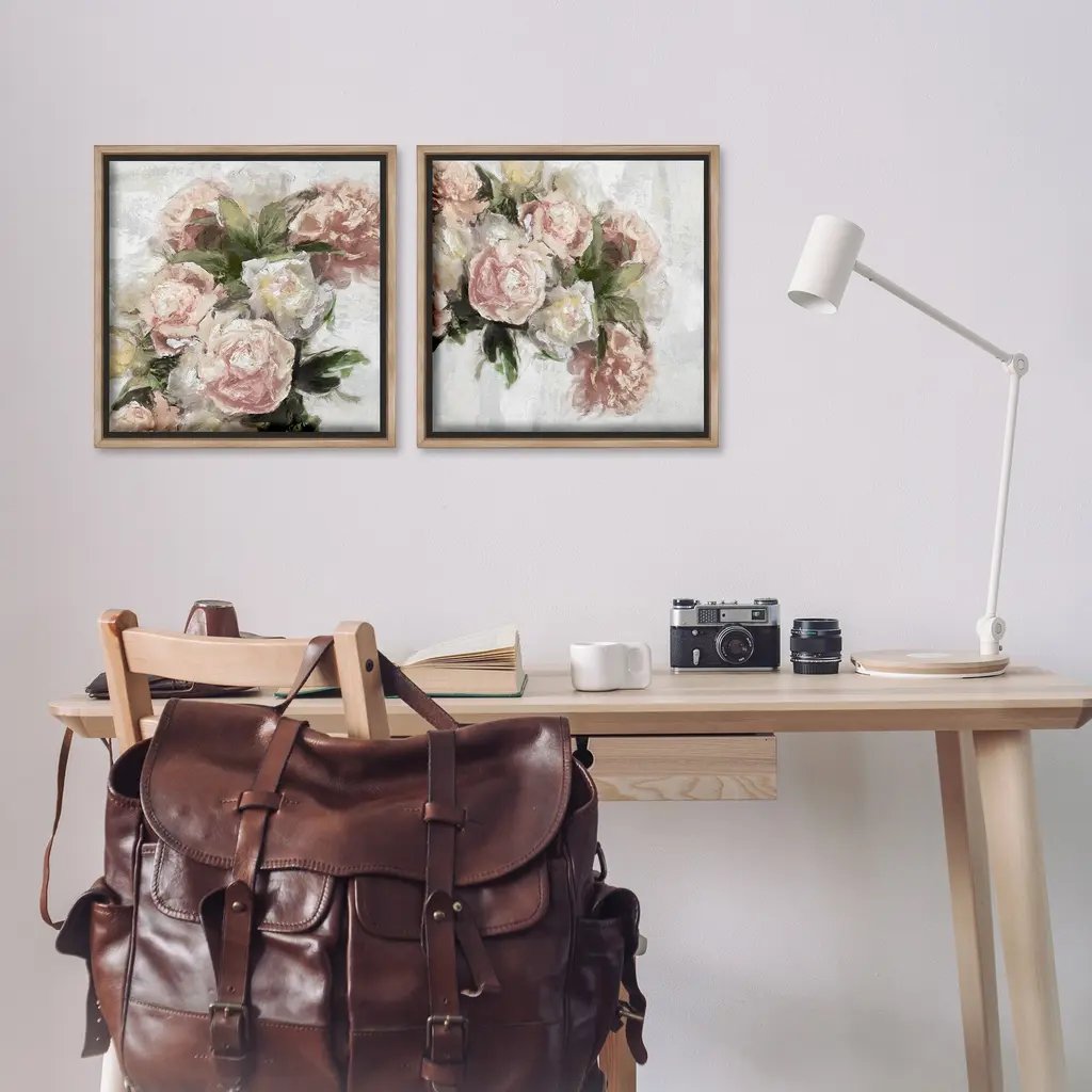 Elevate your home or office to the next level with Stupell Framed Floating Canvas Wall Art. Our premium hand-stretched canvas is mounted securely into a sturdy lightweight frame. The museum-style gap between the wrapped canvas and the box frame gives the illusion of floating artwork. Stupell Wall Art is made in the USA.Features: Dimensions: 2 Piece Set, Each Frame is 18 x 1.7 x 18Two Piece Floating Frame Canvas Products are available as 18"x18" or 25"x25" Panels. All Floating Frame Canvas Products have a 1.7" Depth.Wall Art is Ready to Hang with Hardware Free Hanging. No Installation required. For Easy Set Up Lean or Layer Artwork on Shelf or Against Wall. Artwork is Permently Fixed into the Frame.Our elevated 1.7" Thick Floating Frame is the perfect complement to our canvas style Wall Art. We use only the highest quality inks in house with industry leading printing solutions. Canvas is hand stretched over a durable wood foundation and then mounted securly into a Modern Box Frame. Made in the USA.Artwork Relates To: Floral, Flower, Plant, Rose, Blossom, PeonyDesign by Emily Ford