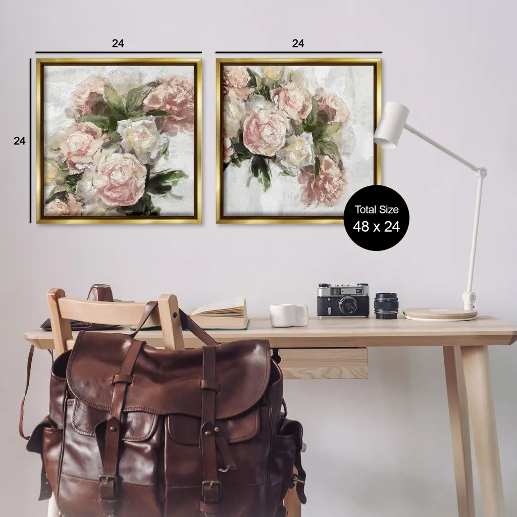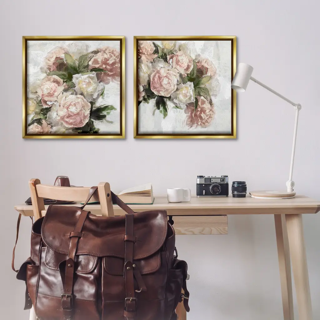 Elevate your home or office to the next level with Stupell Framed Floating Canvas Wall Art. Our premium hand-stretched canvas is mounted securely into a sturdy lightweight frame. The museum-style gap between the wrapped canvas and the box frame gives the illusion of floating artwork. Stupell Wall Art is made in the USA.Features: Dimensions: 2 Piece Set, Each Frame is 18 x 1.7 x 18Two Piece Floating Frame Canvas Products are available as 18"x18" or 25"x25" Panels. All Floating Frame Canvas Products have a 1.7" Depth.Wall Art is Ready to Hang with Hardware Free Hanging. No Installation required. For Easy Set Up Lean or Layer Artwork on Shelf or Against Wall. Artwork is Permently Fixed into the Frame.Our elevated 1.7" Thick Floating Frame is the perfect complement to our canvas style Wall Art. We use only the highest quality inks in house with industry leading printing solutions. Canvas is hand stretched over a durable wood foundation and then mounted securly into a Modern Box Frame. Made in the USA.Artwork Relates To: Floral, Flower, Plant, Rose, Blossom, PeonyDesign by Emily Ford