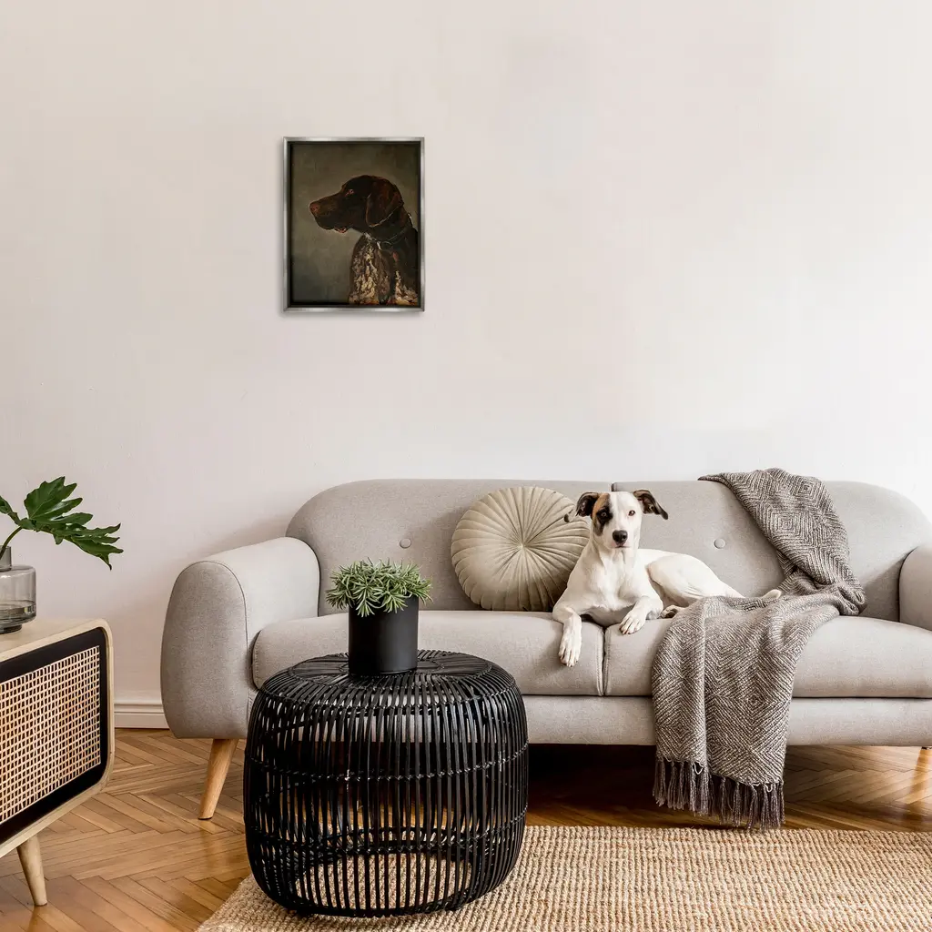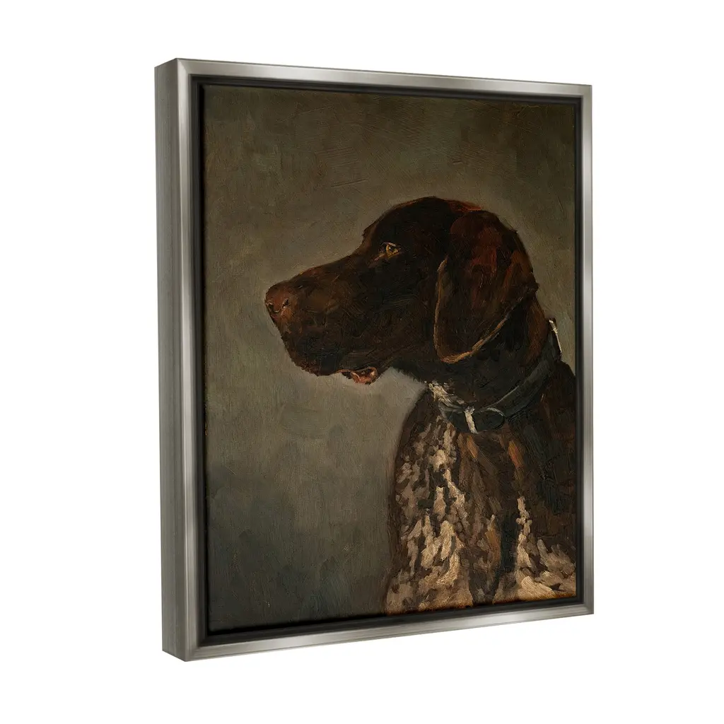 Elevate your home or office to the next level with Stupell Framed Floating Canvas Wall Art. Our premium hand-stretched canvas is mounted securely into a sturdy lightweight frame. The museum-style gap between the wrapped canvas and the box frame gives the illusion of floating artwork. Stupell Wall Art is made in the USA.Features: Dimensions: 17 x 1.7 x 21 Frame, 16 x 1.5 x 20 Canvas ArtFloating Frame Canvas Products are available in sizes 17"x21" and 25"x31". All Floating Frame Canvas Products have a 1.7" Depth.Wall Art is Ready to Hang with Hardware Free Hanging. No Installation required. For Easy Set Up Lean or Layer Artwork on Shelf or Against Wall. Artwork is Permently Fixed into the Frame.Our elevated 1.7" Thick Floating Frame is the perfect complement to our canvas style Wall Art. We use only the highest quality inks in house with industry leading printing solutions. Canvas is hand stretched over a durable wood foundation and then mounted securly into a Modern Box Frame. Made in the USA.Artwork Relates To: Painting, Animal, Canine, Dog, Mammal, Pet, Pointer, Traditional, Portrait, VintageDesign by Marian Parsons