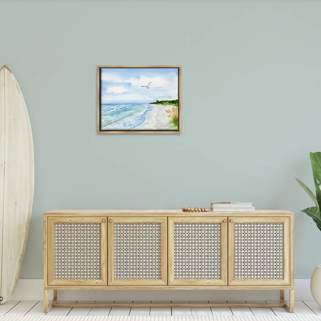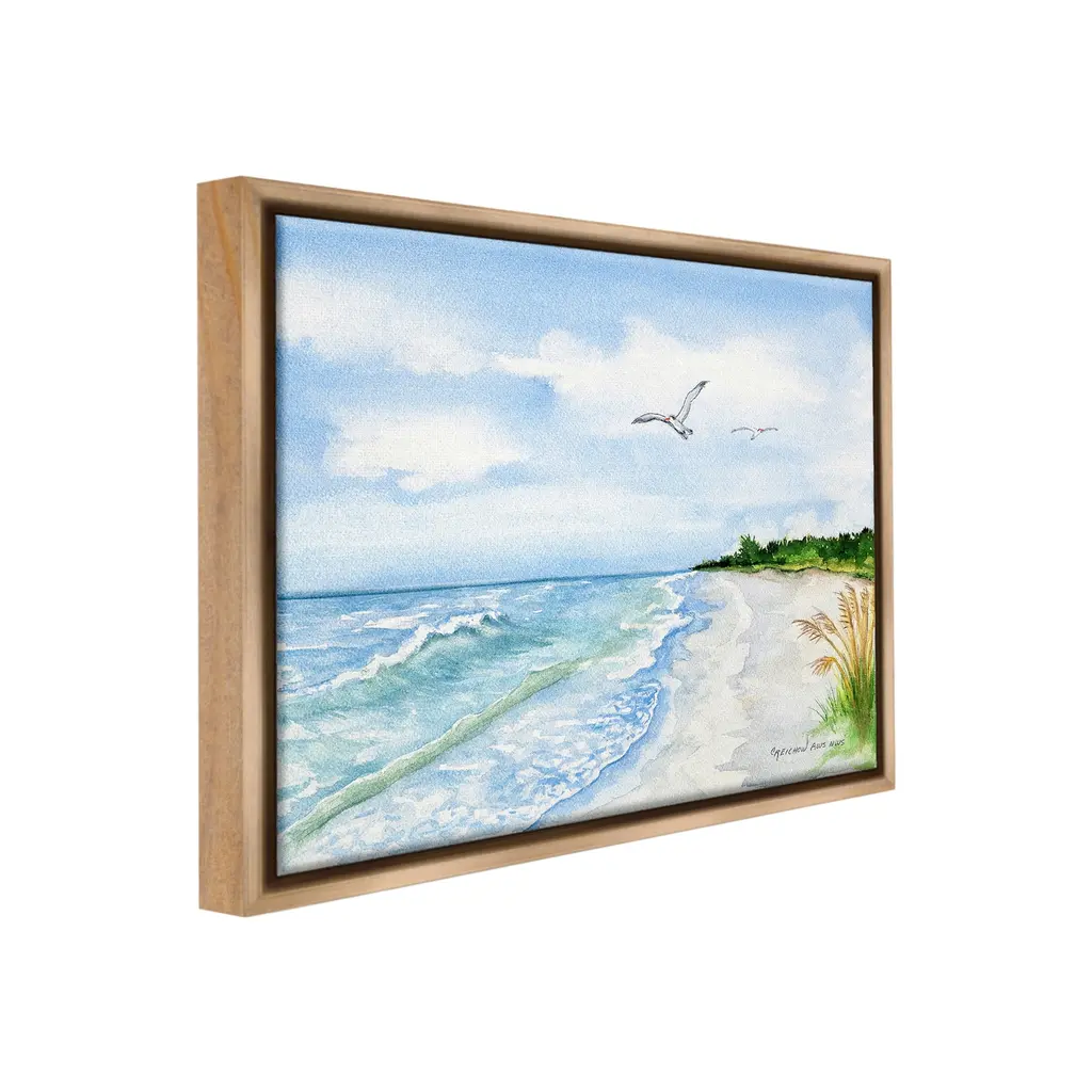 Elevate your home or office to the next level with Stupell Framed Floating Canvas Wall Art. Our premium hand-stretched canvas is mounted securely into a sturdy lightweight frame. The museum-style gap between the wrapped canvas and the box frame gives the illusion of floating artwork. Stupell Wall Art is made in the USA.Features: Dimensions: 21 x 1.7 x 17 Frame, 20 x 1.5 x 16 Canvas ArtFloating Frame Canvas Products are available in sizes 21"x17" and 31"x25". All Floating Frame Canvas Products have a 1.7" Depth.Wall Art is Ready to Hang with Hardware Free Hanging. No Installation required. For Easy Set Up Lean or Layer Artwork on Shelf or Against Wall. Artwork is Permently Fixed into the Frame.Our elevated 1.7" Thick Floating Frame is the perfect complement to our canvas style Wall Art. We use only the highest quality inks in house with industry leading printing solutions. Canvas is hand stretched over a durable wood foundation and then mounted securly into a Modern Box Frame. Made in the USA.Artwork Relates To: Sky, Horizon, Sea, Water, Beach, Coast, Shoreline, Scenery, Sea Waves, Summer, Animal, Bird, SeagullDesign by Christine Reichow