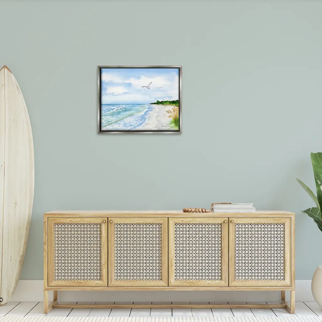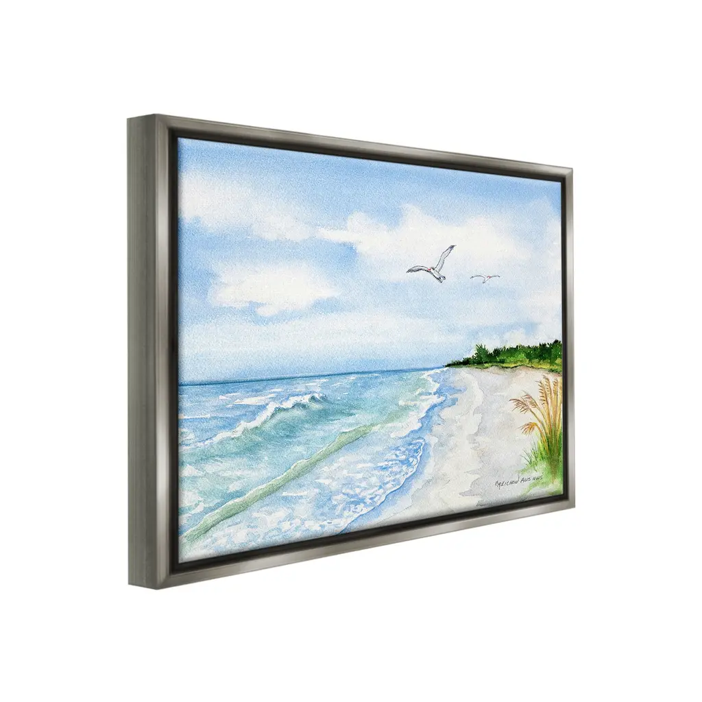 Elevate your home or office to the next level with Stupell Framed Floating Canvas Wall Art. Our premium hand-stretched canvas is mounted securely into a sturdy lightweight frame. The museum-style gap between the wrapped canvas and the box frame gives the illusion of floating artwork. Stupell Wall Art is made in the USA.Features: Dimensions: 21 x 1.7 x 17 Frame, 20 x 1.5 x 16 Canvas ArtFloating Frame Canvas Products are available in sizes 21"x17" and 31"x25". All Floating Frame Canvas Products have a 1.7" Depth.Wall Art is Ready to Hang with Hardware Free Hanging. No Installation required. For Easy Set Up Lean or Layer Artwork on Shelf or Against Wall. Artwork is Permently Fixed into the Frame.Our elevated 1.7" Thick Floating Frame is the perfect complement to our canvas style Wall Art. We use only the highest quality inks in house with industry leading printing solutions. Canvas is hand stretched over a durable wood foundation and then mounted securly into a Modern Box Frame. Made in the USA.Artwork Relates To: Sky, Horizon, Sea, Water, Beach, Coast, Shoreline, Scenery, Sea Waves, Summer, Animal, Bird, SeagullDesign by Christine Reichow