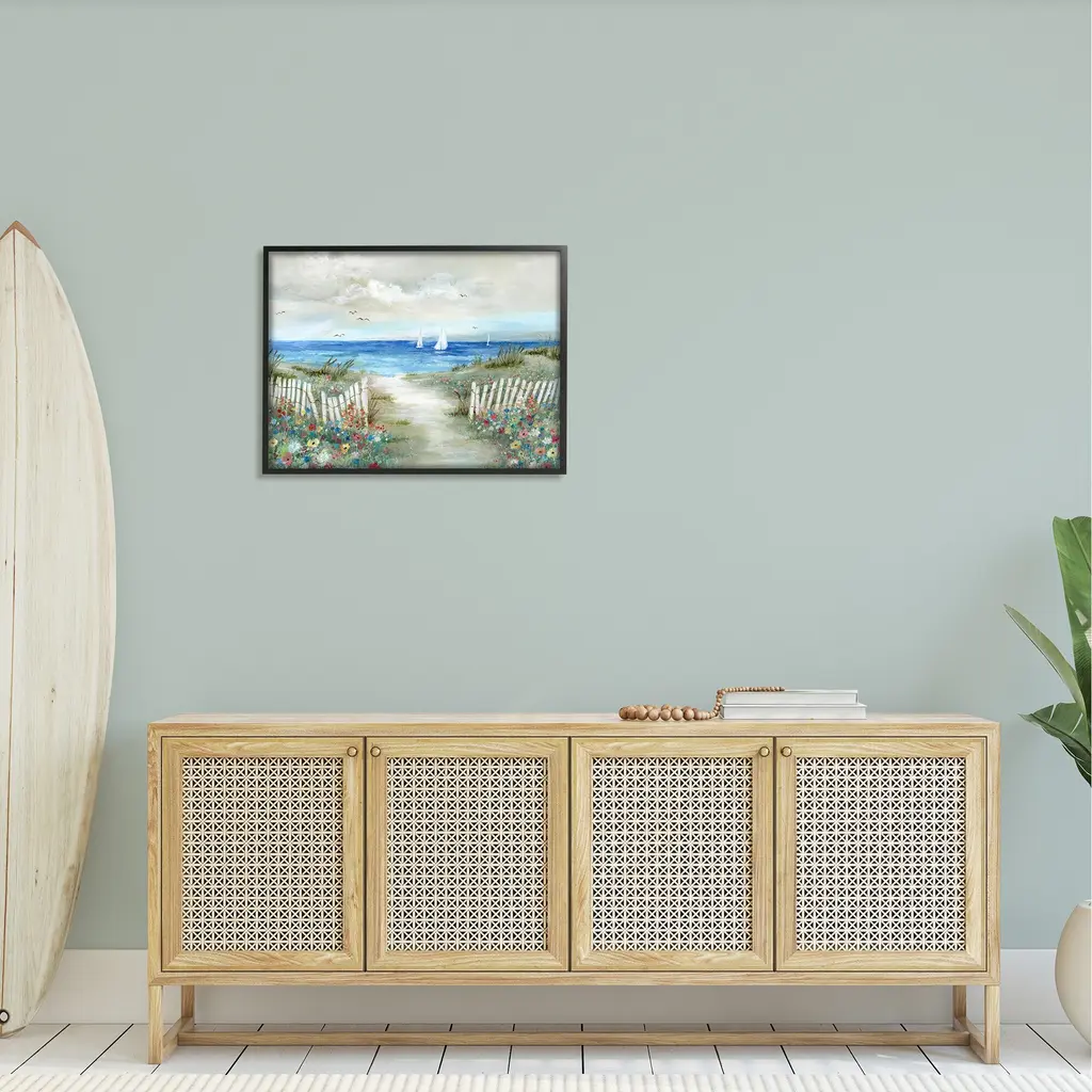 Stupell Tranquil Beachside Flower Meadow Ocean Sailboats Scene Framed Wall Art, Design By Nan - 30 X 24 - Black