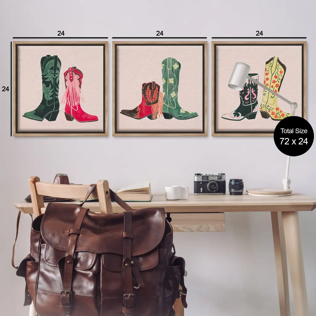 Elevate your home or office to the next level with Stupell Framed Floating Canvas Wall Art. Our premium hand-stretched canvas is mounted securely into a sturdy lightweight frame. The museum-style gap between the wrapped canvas and the box frame gives the illusion of floating artwork. Stupell Wall Art is made in the USA.Features: Dimensions: 3 Piece Set, Each Frame is 18 x 1.7 x 18Three Piece Floating Frame Canvas Products are available as 18"x18" or 25"x25" Panels. All Floating Frame Canvas Products have a 1.7" Depth.Wall Art is Ready to Hang with Hardware Free Hanging. No Installation required. For Easy Set Up Lean or Layer Artwork on Shelf or Against Wall. Artwork is Permently Fixed into the Frame.Our elevated 1.7" Thick Floating Frame is the perfect complement to our canvas style Wall Art. We use only the highest quality inks in house with industry leading printing solutions. Canvas is hand stretched over a durable wood foundation and then mounted securly into a Modern Box Frame. Made in the USA.Artwork Relates To: Cowboy Boot, Cowgirl, Cowboy, Southwestern, Country, Pattern, FashionDesign by Grace Popp