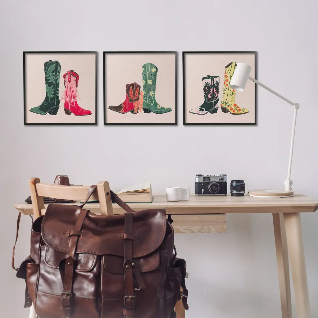 Fill any space in your home or office with our Framed Wall Art Sets. Our framed artwork is securely mounted into a 1.5-inch thick wood grain frame and ready to hang. Frames are available in three alluring styles: black, gray farmhouse and white. Stupell Wall Art is made in the USA.Features: Dimensions: 3 Piece Set, Each Panel is 12 x 1.5 x 12 FramedThree Piece Framed Giclee Sets are available as 12"x12" or 17"x17" Panels. All Framed Giclee Products have a 1.5" Depth.Wall Art is Ready to Hang with Hardware Free Hanging. No installation required. For Easy Set Up Lean or Layer Artwork on Shelf or Against Wall.Curated Wall Art Sets make it easy for you complete the theme for any room. Our giclée prints are carefully mounted on a durable MDF backing, and then perfectly finished in a 1.5 inch thick woodgrain frame. Mounted frame colors include black, gray farmhouse and white. Made In USA.Artwork Relates To: Cowboy Boot, Cowgirl, Cowboy, Southwestern, Country, Pattern, FashionDesign by Grace Popp
