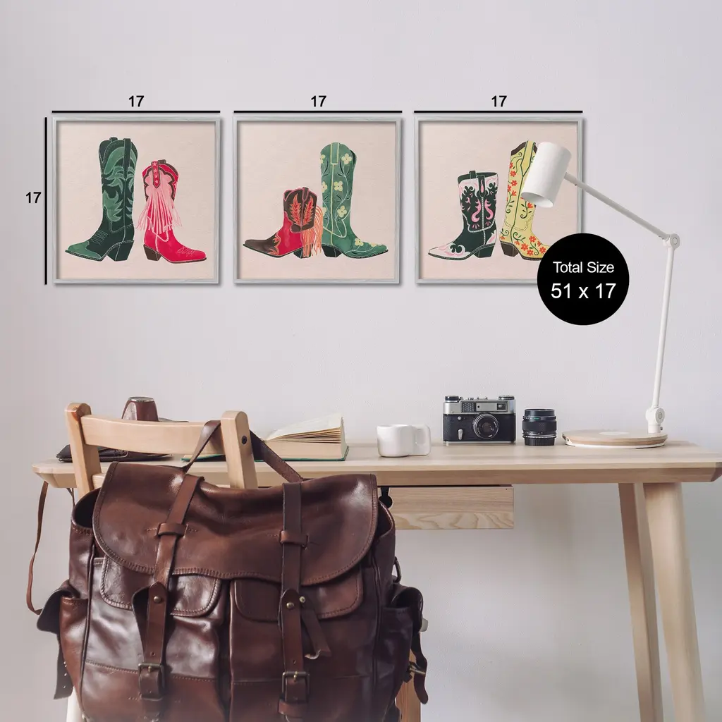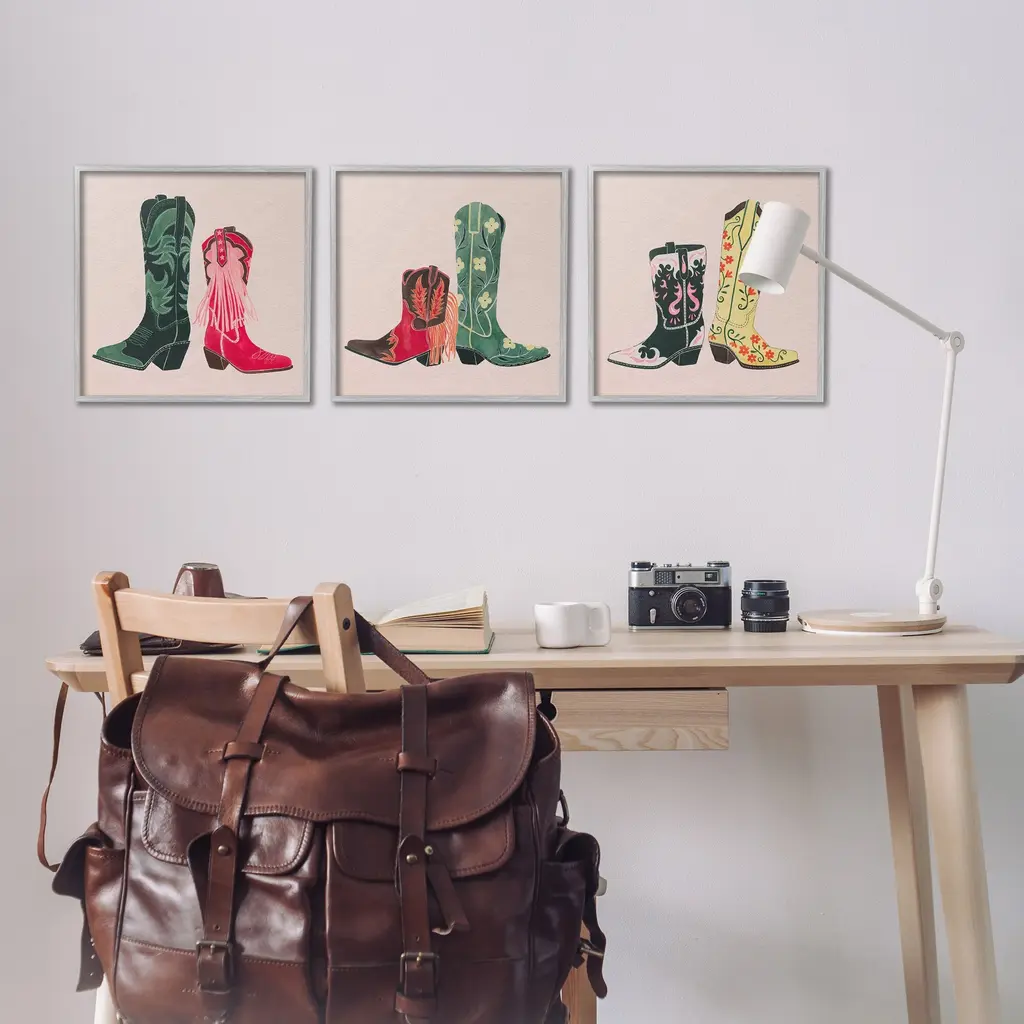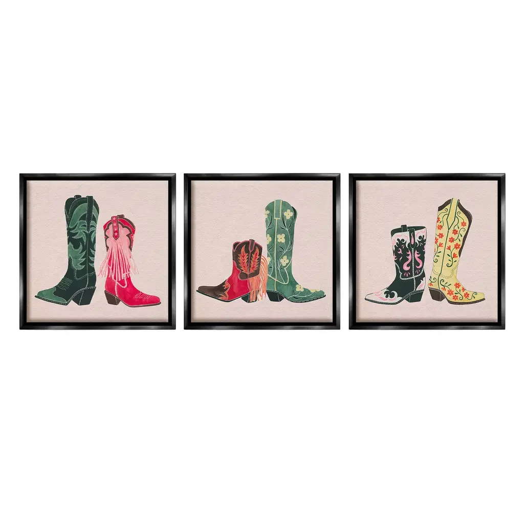Fill any space in your home or office with our Framed Wall Art Sets. Our framed artwork is securely mounted into a 1.5-inch thick wood grain frame and ready to hang. Frames are available in three alluring styles: black, gray farmhouse and white. Stupell Wall Art is made in the USA.Features: Dimensions: 3 Piece Set, Each Panel is 12 x 1.5 x 12 FramedThree Piece Framed Giclee Sets are available as 12"x12" or 17"x17" Panels. All Framed Giclee Products have a 1.5" Depth.Wall Art is Ready to Hang with Hardware Free Hanging. No installation required. For Easy Set Up Lean or Layer Artwork on Shelf or Against Wall.Curated Wall Art Sets make it easy for you complete the theme for any room. Our giclée prints are carefully mounted on a durable MDF backing, and then perfectly finished in a 1.5 inch thick woodgrain frame. Mounted frame colors include black, gray farmhouse and white. Made In USA.Artwork Relates To: Cowboy Boot, Cowgirl, Cowboy, Southwestern, Country, Pattern, FashionDesign by Grace Popp