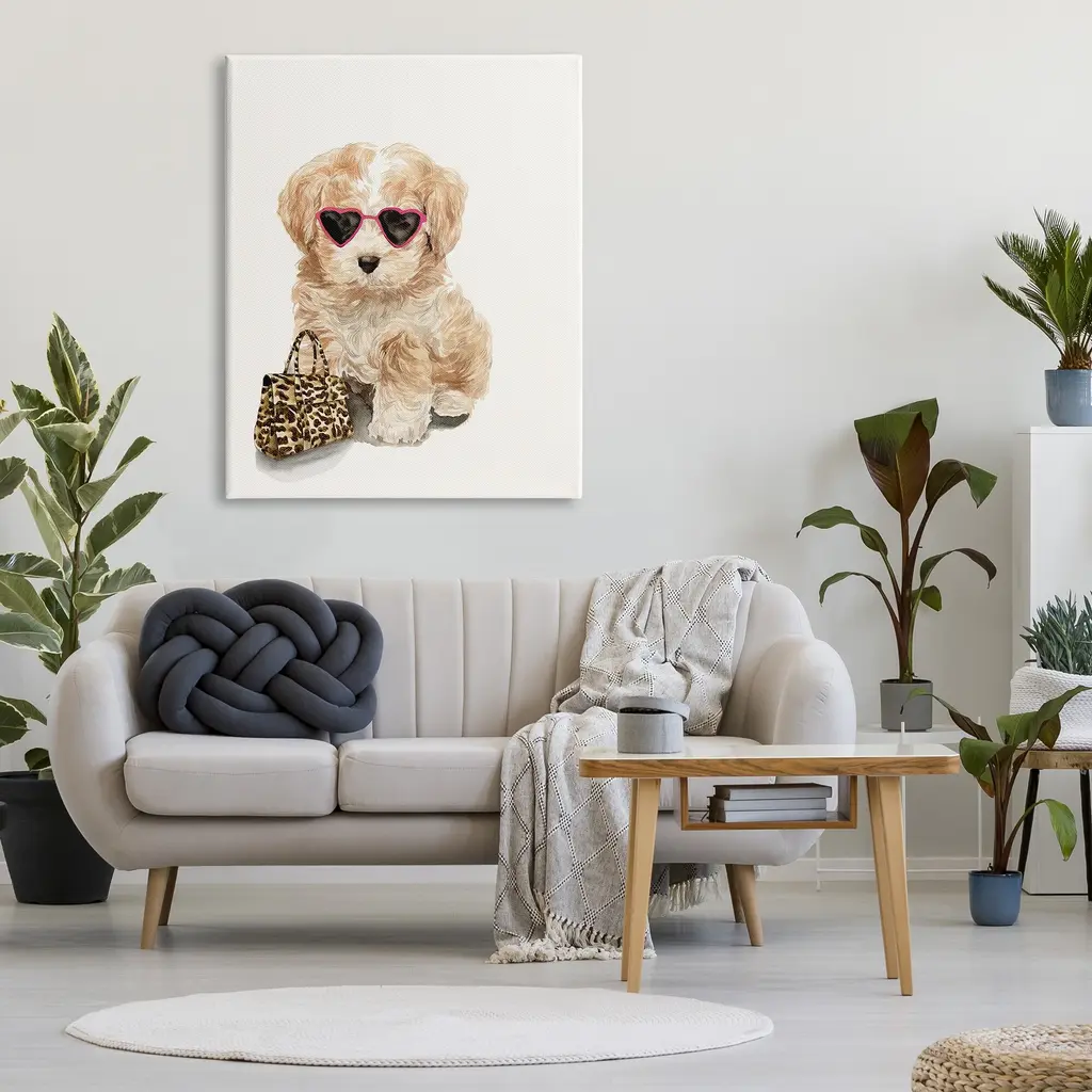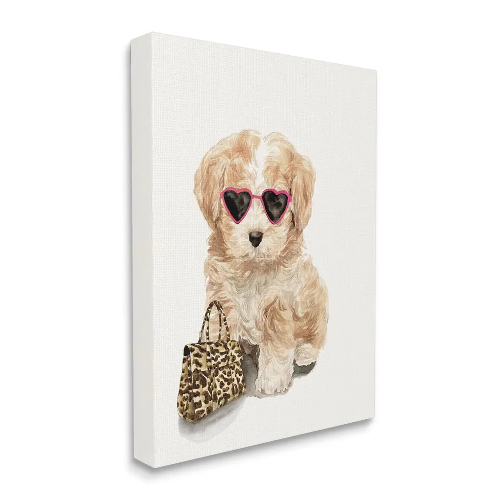 We create our stretched canvas to the highest standards. Using only the highest quality inks and canvas on Mimaki printers, we hand-cut and stretch each piece over a 1.5-inch thick wooden frame for hanging. As a result, the art comes ready to hang on the sturdy ledge with no installation required. Stupell Wall Art is made in the USA.Features: Dimensions: 16 x 1.5 x 20 InchesStretched Canvas Sizes Include Standard: 16 x 1.5 x 20 Large: 20 x 1.5 x 30 X-Large: 30 x 1.5 x 40 Oversized: 36 x 1.5 x 48Wall Art is Ready to Hang with Hardware Free Hanging. No installation required. For Easy Set Up Lean or Layer Artwork on Shelf or Against Wall.Our stretched canvas is created with the highest standards. We use only the highest quality inks and canvas on our in house Mimaki printers, and then hand cut and stretch each piece over a 1.5 inch thick wooden frame for hanging. Made In USA.Artwork Relates To: Handbag, Sunglasses, Purse, Animal, Canine, Mammal, Dog, Pet, Puppy, Glam, FashionDesign by Masey St. Studios