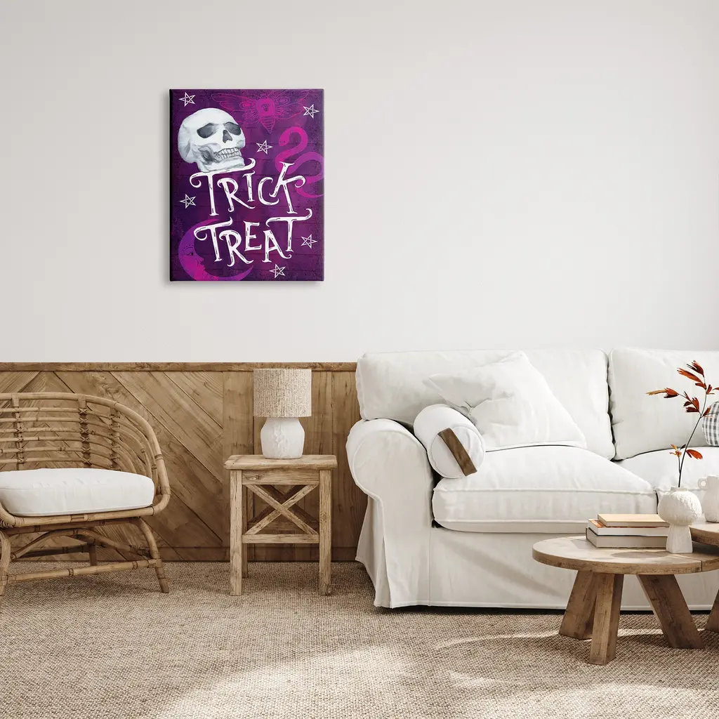 We create our stretched canvas to the highest standards. Using only the highest quality inks and canvas on Mimaki printers, we hand-cut and stretch each piece over a 1.5-inch thick wooden frame for hanging. As a result, the art comes ready to hang on the sturdy ledge with no installation required. Stupell Wall Art is made in the USA.Features: Dimensions: 16 x 1.5 x 20 InchesStretched Canvas Sizes Include Standard: 16 x 1.5 x 20 Large: 20 x 1.5 x 30 X-Large: 30 x 1.5 x 40 Oversized: 36 x 1.5 x 48Wall Art is Ready to Hang - No Installation or Hardware Needed. For Easy Set Up Lean or Layer Artwork on Shelf or Against Wall.Our stretched canvas is created with the highest standards. We use only the highest quality inks and canvas on our in house Mimaki printers, and then hand cut and stretch each piece over a 1.5 inch thick wooden frame for hanging. Made In USA.Artwork Relates To: Purple, Skull, Snake, Moon, Moth, Spooky, Halloween, Trick TreatDesign by ND Art