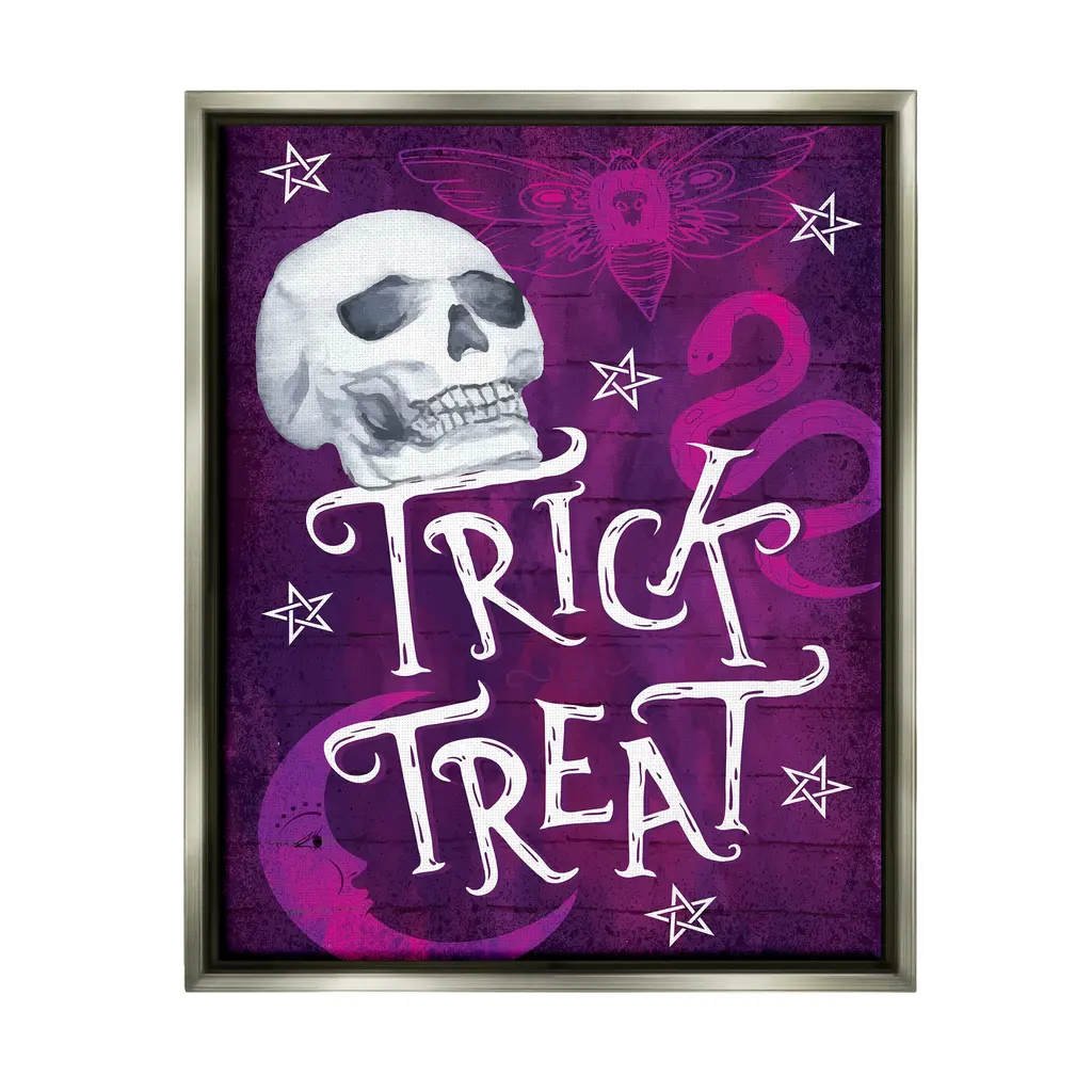 Elevate your home or office to the next level with Stupell Framed Floating Canvas Wall Art. Our premium hand-stretched canvas is mounted securely into a sturdy lightweight frame. The museum-style gap between the wrapped canvas and the box frame gives the illusion of floating artwork. Stupell Wall Art is made in the USA.Features: Dimensions: 17 x 1.7 x 21 Frame, 16 x 1.5 x 20 Canvas ArtFloating Frame Sizes Include Standard: 17 x 1.7 x 21 Oversized: 25 x 1.7 x 31Wall Art is Ready to Hang - No Installation or Hardware Needed. For Easy Set Up Lean or Layer Artwork on Shelf or Against Wall.Our elevated 1.7" Thick Floating Frame is the perfect complement to our canvas style Wall Art. We use only the highest quality inks in house with industry leading printing solutions. Canvas is hand stretched over a durable wood foundation and then mounted securly into a Modern Box Frame. Made in the USA.Artwork Relates To: Purple, Skull, Snake, Moon, Moth, Spooky, Halloween, Trick TreatDesign by ND Art
