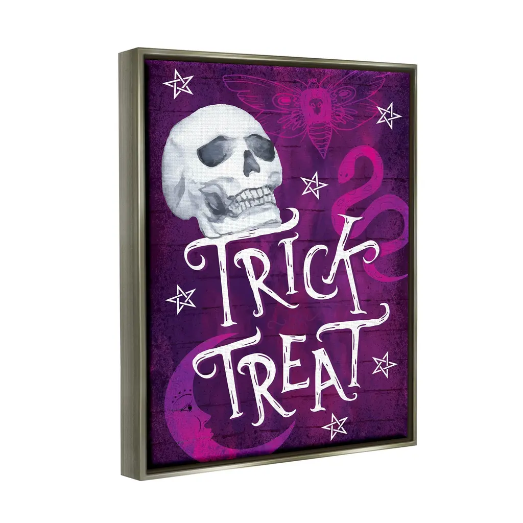 Elevate your home or office to the next level with Stupell Framed Floating Canvas Wall Art. Our premium hand-stretched canvas is mounted securely into a sturdy lightweight frame. The museum-style gap between the wrapped canvas and the box frame gives the illusion of floating artwork. Stupell Wall Art is made in the USA.Features: Dimensions: 17 x 1.7 x 21 Frame, 16 x 1.5 x 20 Canvas ArtFloating Frame Sizes Include Standard: 17 x 1.7 x 21 Oversized: 25 x 1.7 x 31Wall Art is Ready to Hang - No Installation or Hardware Needed. For Easy Set Up Lean or Layer Artwork on Shelf or Against Wall.Our elevated 1.7" Thick Floating Frame is the perfect complement to our canvas style Wall Art. We use only the highest quality inks in house with industry leading printing solutions. Canvas is hand stretched over a durable wood foundation and then mounted securly into a Modern Box Frame. Made in the USA.Artwork Relates To: Purple, Skull, Snake, Moon, Moth, Spooky, Halloween, Trick TreatDesign by ND Art