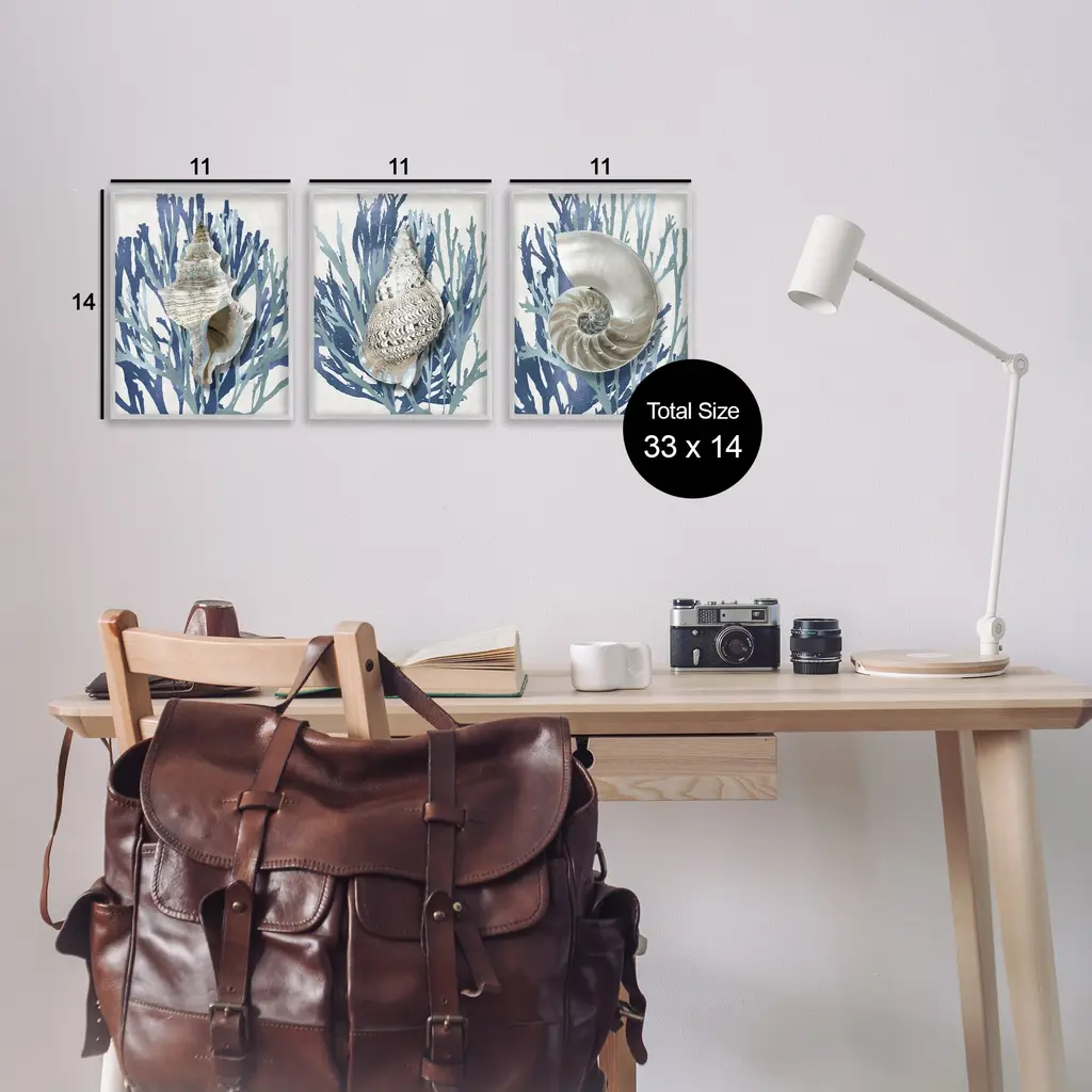 Stupell Trio Of Shell Coral Blue Beach Design, 3Pc Multi Piece Framed Wall Art Set - 11 X 14 - Grey