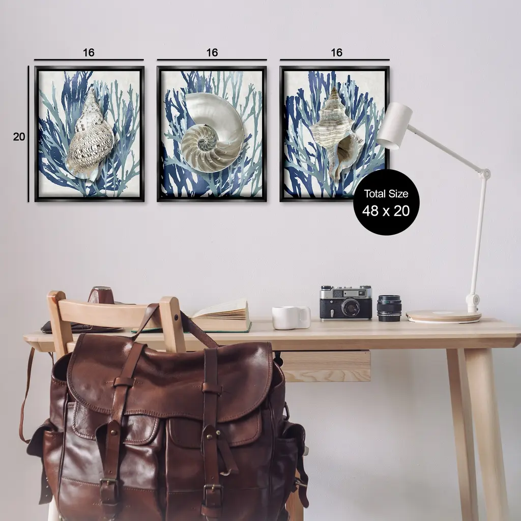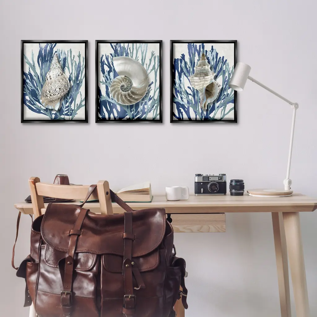Elevate your home or office to the next level with Stupell Framed Floating Canvas Wall Art. Our premium hand-stretched canvas is mounted securely into a sturdy lightweight frame. The museum-style gap between the wrapped canvas and the box frame gives the illusion of floating artwork. Stupell Wall Art is made in the USA.Features: Dimensions: 3 Piece Set, Each Frame is 17 x 1.7 x 21Three Piece Floater Framed Canvas are available as 17x21 or 25x31 Panels. All Floater Frame Products have a 1.7" Depth.Wall Art is Ready to Hang with Hardware Free Hanging. No Installation required. For Easy Set Up Lean or Layer Artwork on Shelf or Against Wall. Artwork is Permently Fixed into the Frame.Our elevated 1.7" Thick Floating Frame is the perfect complement to our canvas style Wall Art. We use only the highest quality inks in house with industry leading printing solutions. Canvas is hand stretched over a durable wood foundation and then mounted securly into a Modern Box Frame. Made in the USA.Artwork Relates To: Nautical, Beach, Sea Life, Seashell, Conch, Nautilus, CoralDesign by Caroline Kelly