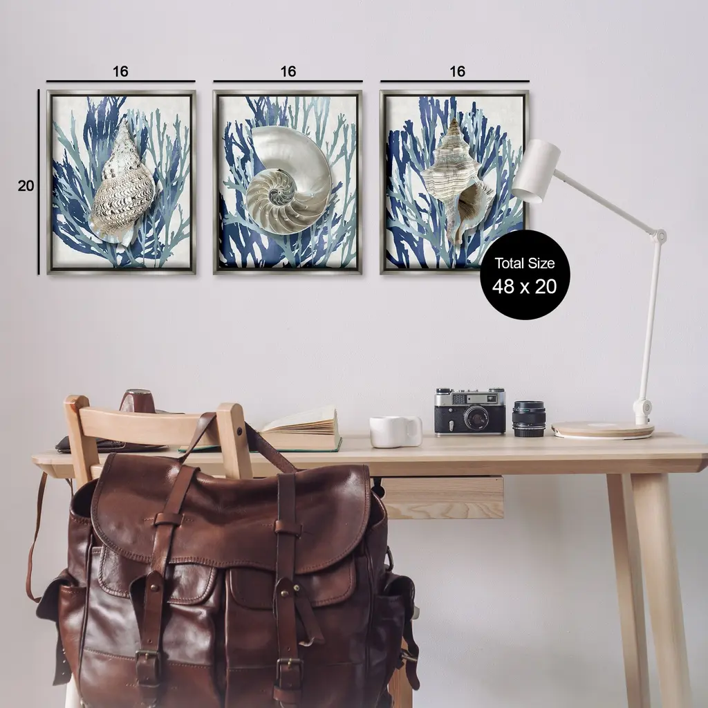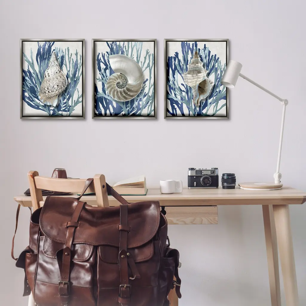 Elevate your home or office to the next level with Stupell Framed Floating Canvas Wall Art. Our premium hand-stretched canvas is mounted securely into a sturdy lightweight frame. The museum-style gap between the wrapped canvas and the box frame gives the illusion of floating artwork. Stupell Wall Art is made in the USA.Features: Dimensions: 3 Piece Set, Each Frame is 17 x 1.7 x 21Three Piece Floater Framed Canvas are available as 17x21 or 25x31 Panels. All Floater Frame Products have a 1.7" Depth.Wall Art is Ready to Hang with Hardware Free Hanging. No Installation required. For Easy Set Up Lean or Layer Artwork on Shelf or Against Wall. Artwork is Permently Fixed into the Frame.Our elevated 1.7" Thick Floating Frame is the perfect complement to our canvas style Wall Art. We use only the highest quality inks in house with industry leading printing solutions. Canvas is hand stretched over a durable wood foundation and then mounted securly into a Modern Box Frame. Made in the USA.Artwork Relates To: Nautical, Beach, Sea Life, Seashell, Conch, Nautilus, CoralDesign by Caroline Kelly
