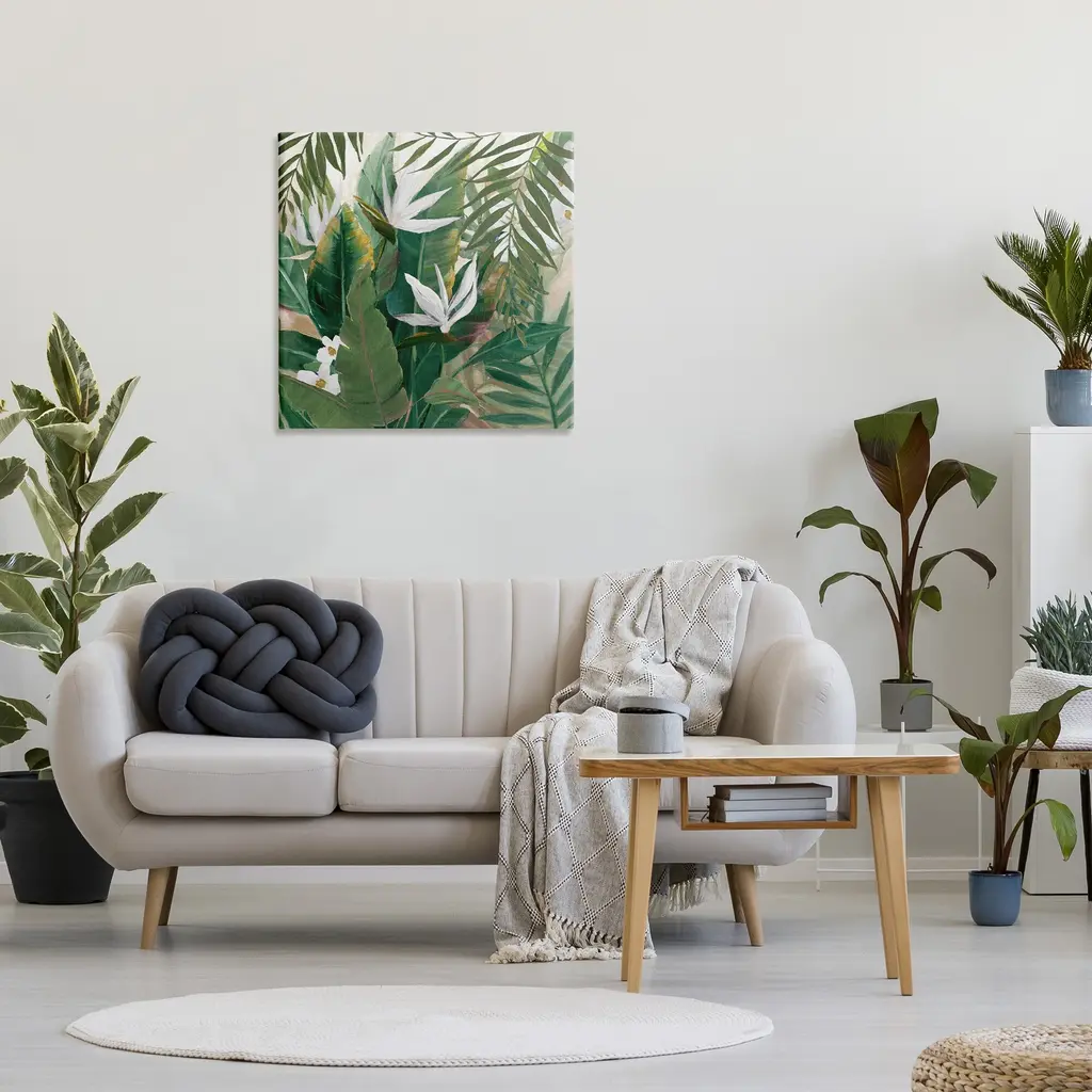 Proudly made in the USA, Our stretched canvas is created with the highest standards. We use only the highest quality inks and canvas on our in house Mimaki printers, and then hand cut and stretch each piece over a 1.5 inch thick wooden frame for hanging. The art comes ready to hang with no installation required.Features: Dimensions: 17 x 1.5 x 17 InchesStretched Canvas Sizes Include Standard: 17 x 1.5 x 17 Large: 24 x 1.5 x 24 X-Large: 30 x 1.5 x 30 Oversized: 36 x 1.5 x 36Wall Art is Ready to Hang - No Installation or Hardware Needed. For Easy Set Up Lean or Layer Artwork on Shelf or Against Wall.Our stretched canvas is created with the highest standards. We use only the highest quality inks and canvas on our in house Mimaki printers, and then hand cut and stretch each piece over a 1.5 inch thick wooden frame for hanging. Made In USA.Artwork Relates To: Leaf, Plant, Vegetation, Painting, Flower, Jungle, Nature, Petal, Rainforest, Modern, Floral, Birds of ParadiseDesign by Nan