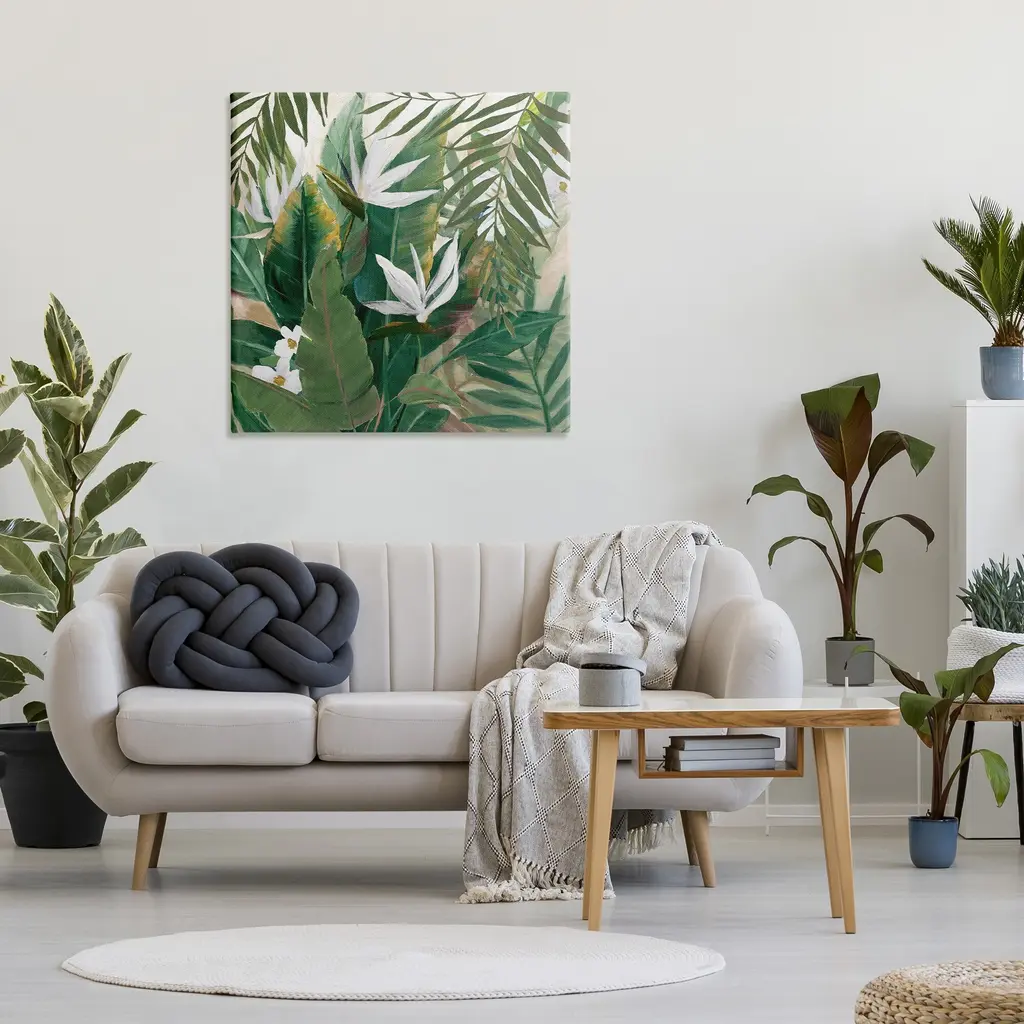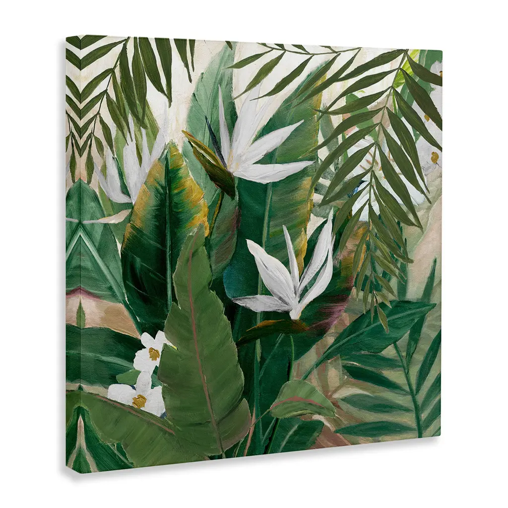 Proudly made in the USA, Our stretched canvas is created with the highest standards. We use only the highest quality inks and canvas on our in house Mimaki printers, and then hand cut and stretch each piece over a 1.5 inch thick wooden frame for hanging. The art comes ready to hang with no installation required.Features: Dimensions: 17 x 1.5 x 17 InchesStretched Canvas Sizes Include Standard: 17 x 1.5 x 17 Large: 24 x 1.5 x 24 X-Large: 30 x 1.5 x 30 Oversized: 36 x 1.5 x 36Wall Art is Ready to Hang - No Installation or Hardware Needed. For Easy Set Up Lean or Layer Artwork on Shelf or Against Wall.Our stretched canvas is created with the highest standards. We use only the highest quality inks and canvas on our in house Mimaki printers, and then hand cut and stretch each piece over a 1.5 inch thick wooden frame for hanging. Made In USA.Artwork Relates To: Leaf, Plant, Vegetation, Painting, Flower, Jungle, Nature, Petal, Rainforest, Modern, Floral, Birds of ParadiseDesign by Nan