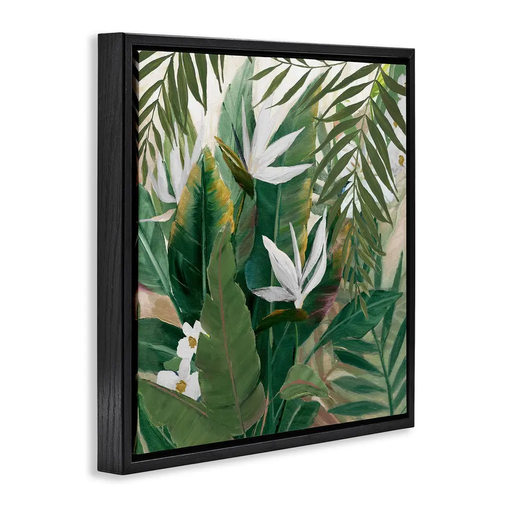 Elevate your home or office to the next level with Stupell Framed Floating Canvas Wall Art. Our premium hand-stretched canvas is mounted securely into a sturdy lightweight frame. The museum-style gap between the wrapped canvas and the box frame gives the illusion of floating artwork. Stupell Wall Art is made in the USA.Features: Dimensions: 18 x 1.7 x 18 Frame, 17 x 1.5 x 17 Canvas ArtFloating Frame Canvas Products are available in sizes 18"x18" and 25"x25". All Floating Frame Canvas Products have a 1.7" Depth.Wall Art is Ready to Hang with Hardware Free Hanging. No Installation required. For Easy Set Up Lean or Layer Artwork on Shelf or Against Wall. Artwork is Permently Fixed into the Frame.Our elevated 1.7" Thick Floating Frame is the perfect complement to our canvas style Wall Art. We use only the highest quality inks in house with industry leading printing solutions. Canvas is hand stretched over a durable wood foundation and then mounted securly into a Modern Box Frame. Made in the USA.Artwork Relates To: Leaf, Plant, Vegetation, Painting, Flower, Jungle, Nature, Petal, Rainforest, Tropical, Floral, Birds of ParadiseDesign by Nan
