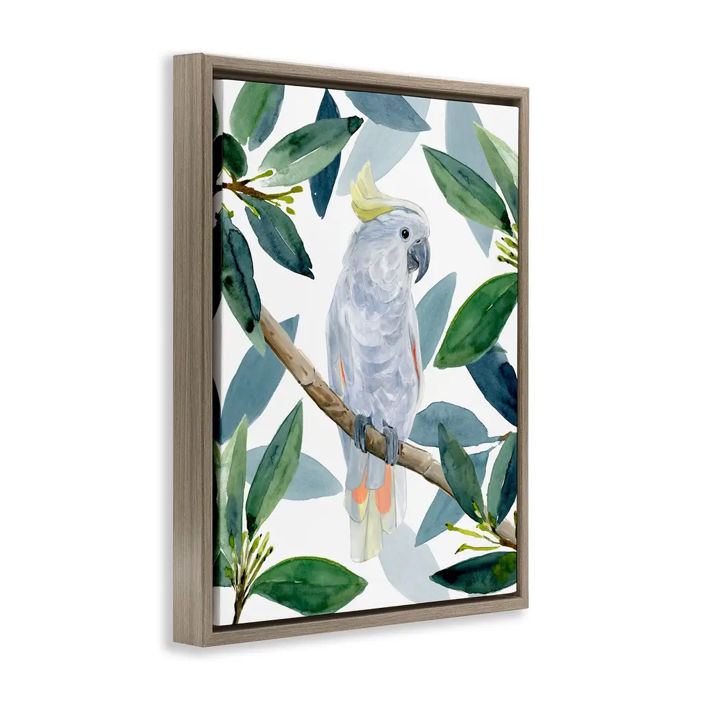 Elevate your home or office to the next level with Stupell Framed Floating Canvas Wall Art. Our premium hand-stretched canvas is mounted securely into a sturdy lightweight frame. The museum-style gap between the wrapped canvas and the box frame gives the illusion of floating artwork. Stupell Wall Art is made in the USA.Features: Dimensions: 17 x 1.7 x 21 Frame, 16 x 1.5 x 20 Canvas ArtFloating Frame Canvas Products are available in sizes 17"x21" and 25"x31". All Floating Frame Canvas Products have a 1.7" Depth.Wall Art is Ready to Hang with Hardware Free Hanging. No Installation required. For Easy Set Up Lean or Layer Artwork on Shelf or Against Wall. Artwork is Permently Fixed into the Frame.Our elevated 1.7" Thick Floating Frame is the perfect complement to our canvas style Wall Art. We use only the highest quality inks in house with industry leading printing solutions. Canvas is hand stretched over a durable wood foundation and then mounted securly into a Modern Box Frame. Made in the USA.Artwork Relates To: Tropical, Plant, Botanical, Leaf, Cockatiel, Bird, Animal, CockatooDesign by Annie Warren