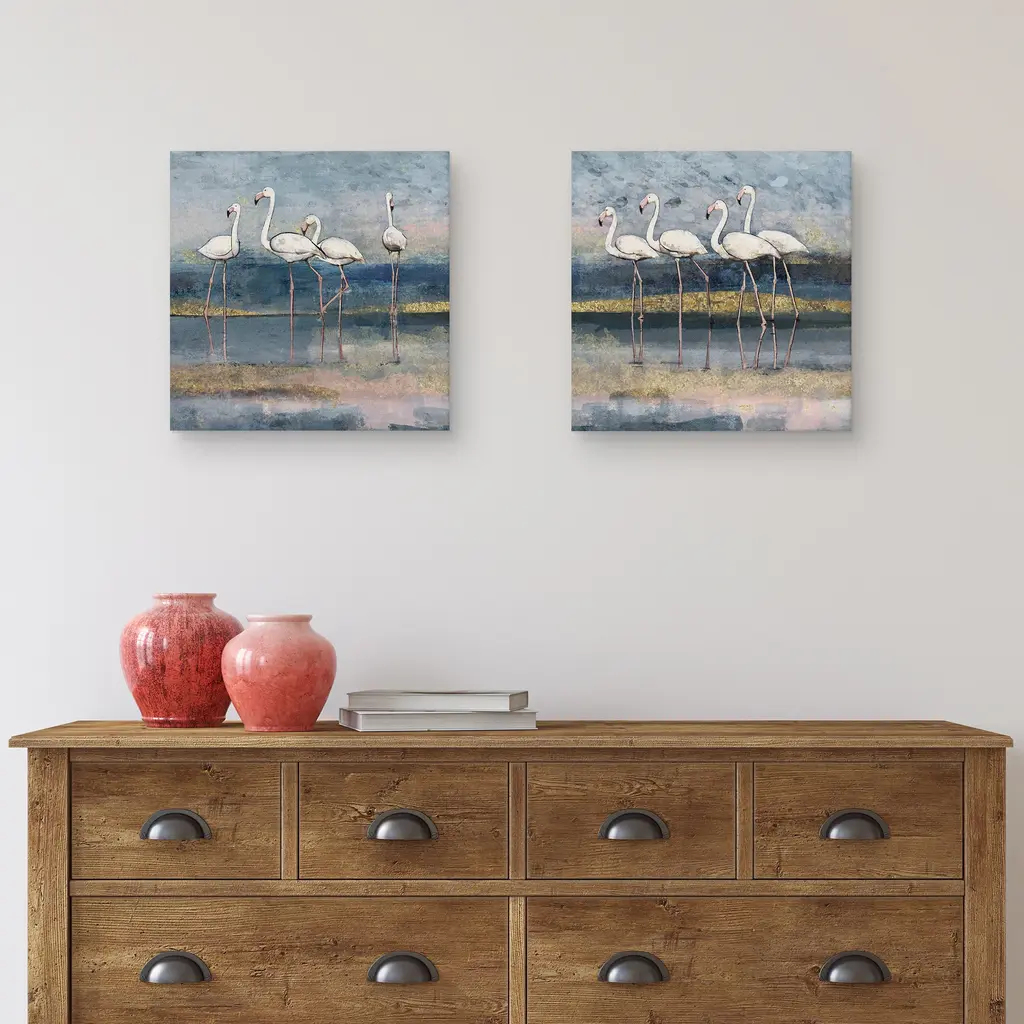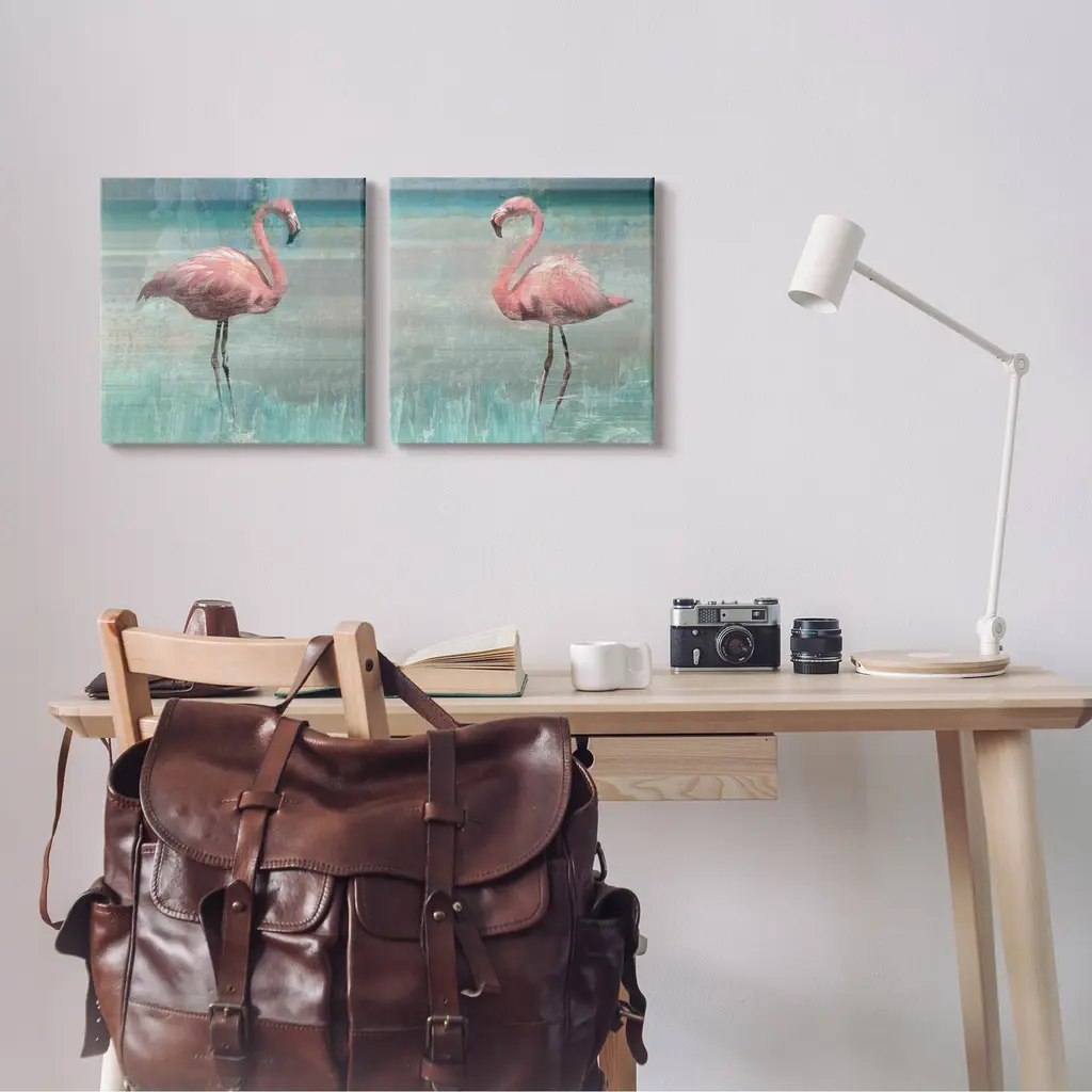 The more the better, right? Multi-Piece Canvas Sets help fill up the entire wall with excitement. Proudly made in the USA, Our stretched canvas is created with the highest standards. We use only the highest quality inks and canvas on our in house printers, and then hand cut and stretch each piece over a 1.5 inch thick wooden frame for hanging. The art comes ready to hang with no installation required.Features:Dimensions: 2 Piece Set, Each Panel is 17 x 1.5 x 17 InchesStretched Canvas Set Sizes IncludeStandard: 2pc, Each is 17 x 1.5 x 17Large: 2pc, Each is 24 x 1.5 x 24Wall Art is Ready to Hang - No Installation or Hardware Needed. For Easy Set Up Lean or Layer Artwork on Shelf or Against Wall.Our stretched canvas is created with the highest standards. We use only the highest quality inks and canvas on our in house Mimaki printers, and then hand cut and stretch each piece over a 1.5 inch thick wooden frame for hanging. Made In USA.Artwork Relates To: Bird; Animal; Flamingo; Beak; Scenery, TropicalDesign by Nan