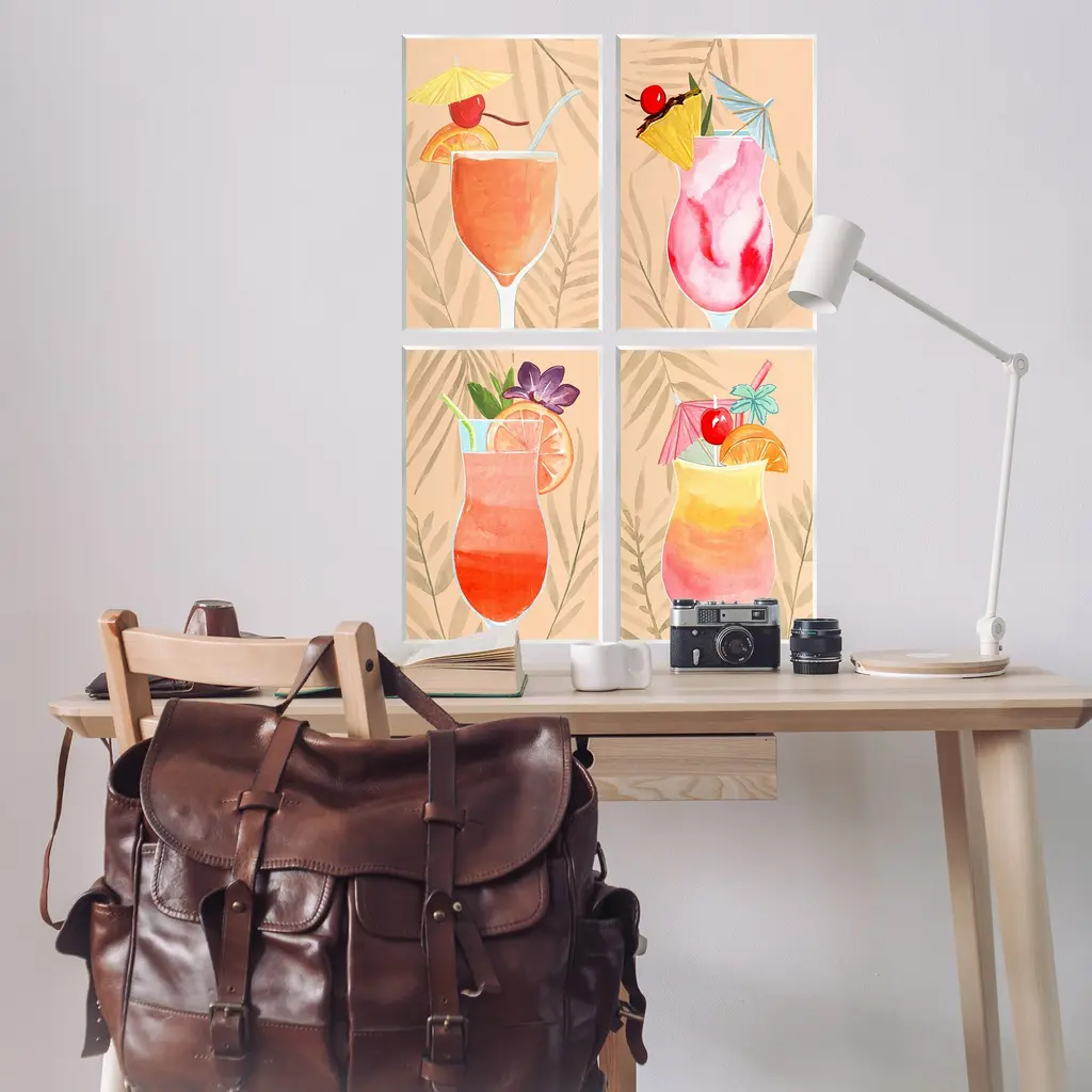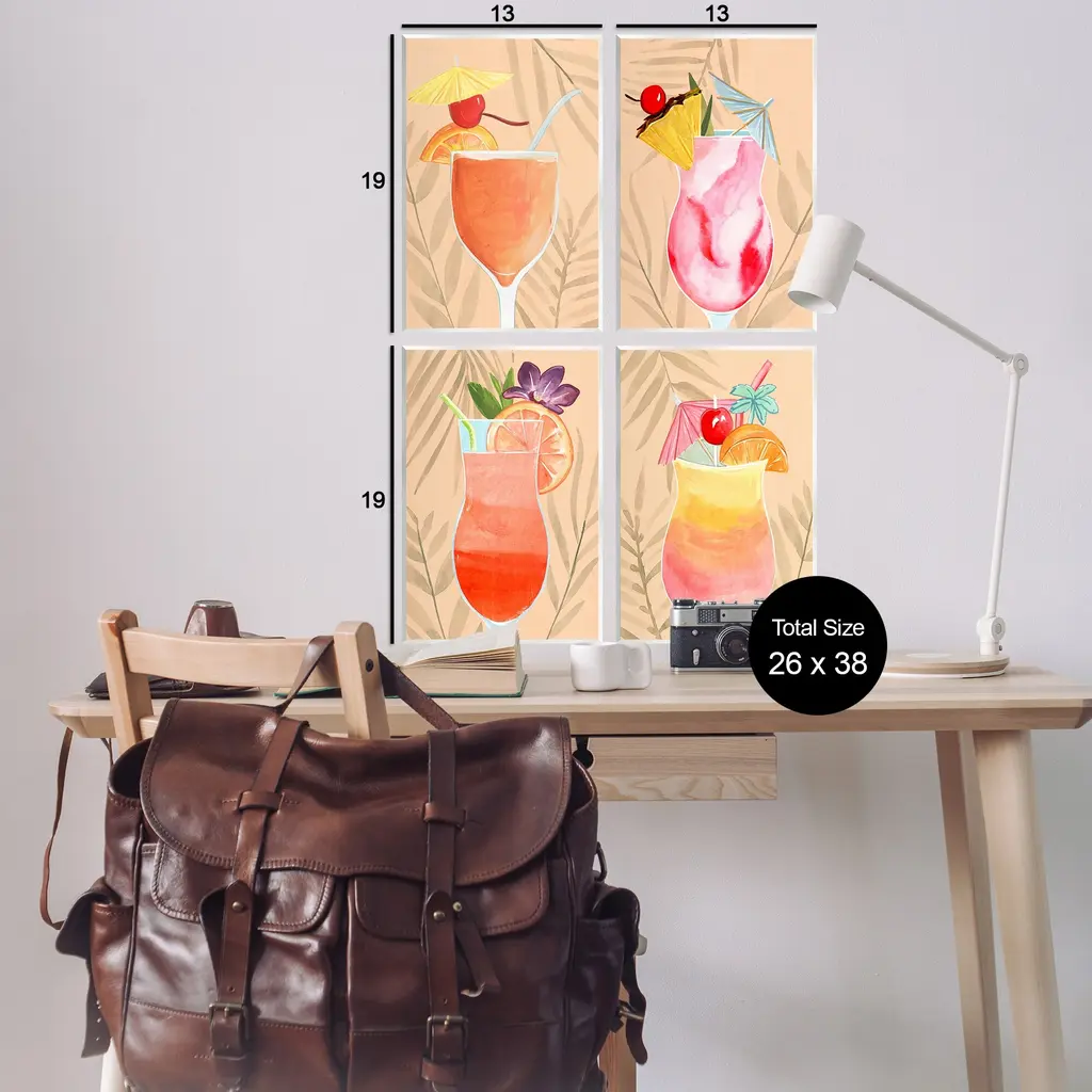 Fill any space with Stupell Wall Art Sets. Our wall plaques start as high-quality lithograph prints mounted on durable 0.5-inch thick MDF wood. Each piece is hand finished and comes with a fresh layer of white foil on the sides to give it a crisp, clean look. Plaques arrive ready to hang without installation and come with removable plastic corners to keep them from damage in transit. Stupell Wall Art is made in the USA.Features: Dimensions: 4 Piece Set, Each Panel is 10 x 0.5 x 15 InchesFour Piece Wall Plaque Sets are available as 10"x15" or 13"x19" Panels. All wall plaques have a 0.5" Depth.Wall Art is Ready to Hang with Hardware Free Hanging. No installation required. For Easy Set Up Lean or Layer Artwork on Shelf or Against Wall.All of our wall plaques start off as high quality lithograph prints that are then mounted on durable 0.5 inch thick MDF wood. Each piece is hand finished and comes with a fresh layer of foil on the sides to give it a crisp clean look. Made In USA.Artwork Relates To: Gl, Alcohol, Beverage, Cocktail, Juice, Fruit, Plant, Citrus, Liquor, Wine, Botanical, Pattern, TropicalDesign by Annie Warren