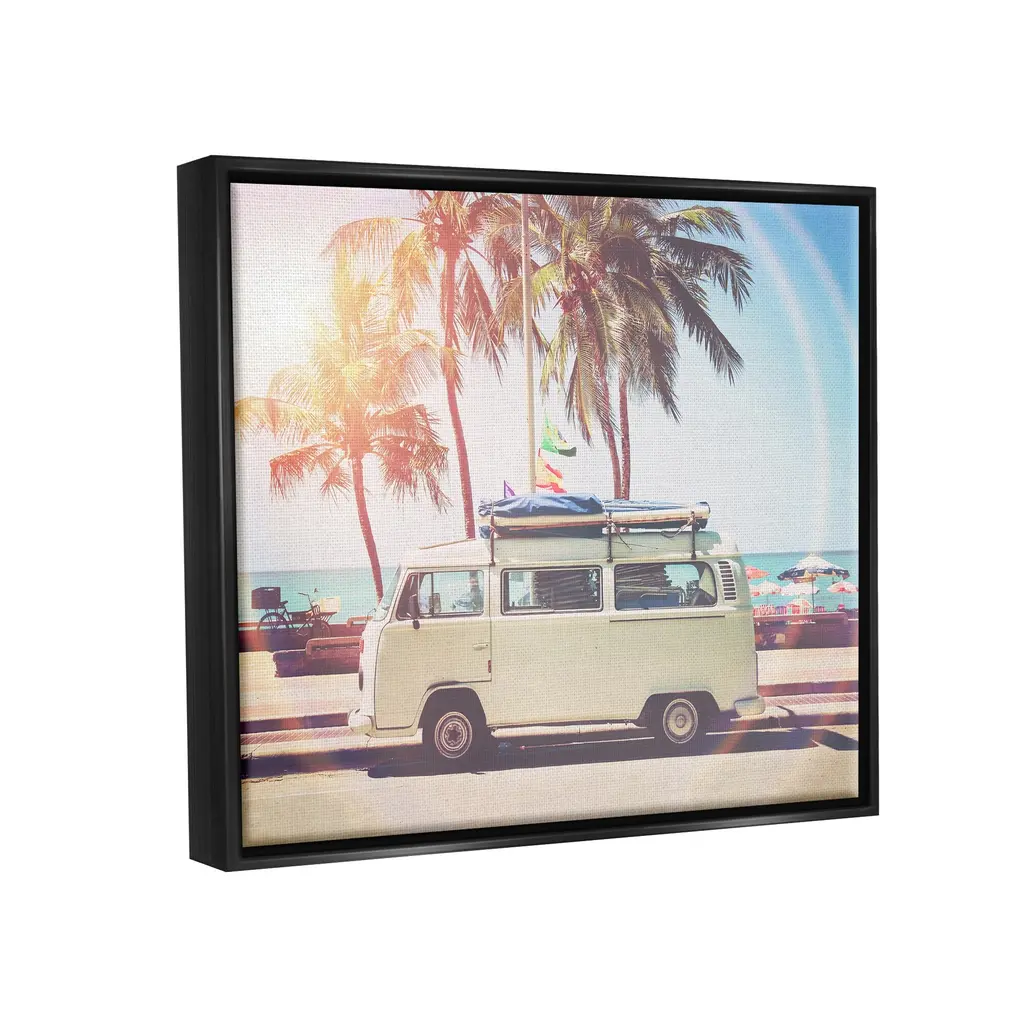 Elevate your home or office to the next level with Stupell Framed Floating Canvas Wall Art. Our premium hand-stretched canvas is mounted securely into a sturdy lightweight frame. The museum-style gap between the wrapped canvas and the box frame gives the illusion of floating artwork. Stupell Wall Art is made in the USA.Features: Dimensions: 21 x 1.7 x 17 Frame, 20 x 1.5 x 16 Canvas ArtFloating Frame Sizes Include Standard: 21 x 1.7 x 17 Oversized: 31 x 1.7 x 25Wall Art is Ready to Hang with Hardware Free Hanging. No installation required. For Easy Set Up Lean or Layer Artwork on Shelf or Against Wall.Our elevated 1.7" Thick Floating Frame is the perfect complement to our canvas style Wall Art. We use only the highest quality inks in house with industry leading printing solutions. Canvas is hand stretched over a durable wood foundation and then mounted securly into a Modern Box Frame. Made in the USA.Artwork Relates To: Car, Transportation, Vehicle, Bicycle, Van, Caravan, Vacation, Beach, Palm Tree, ShoreDesign by Sisi and Seb