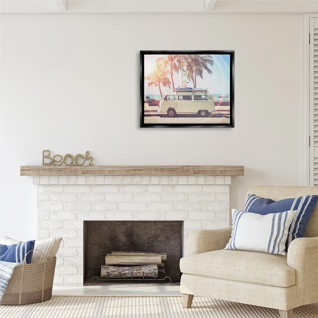 Elevate your home or office to the next level with Stupell Framed Floating Canvas Wall Art. Our premium hand-stretched canvas is mounted securely into a sturdy lightweight frame. The museum-style gap between the wrapped canvas and the box frame gives the illusion of floating artwork. Stupell Wall Art is made in the USA.Features: Dimensions: 21 x 1.7 x 17 Frame, 20 x 1.5 x 16 Canvas ArtFloating Frame Sizes Include Standard: 21 x 1.7 x 17 Oversized: 31 x 1.7 x 25Wall Art is Ready to Hang with Hardware Free Hanging. No installation required. For Easy Set Up Lean or Layer Artwork on Shelf or Against Wall.Our elevated 1.7" Thick Floating Frame is the perfect complement to our canvas style Wall Art. We use only the highest quality inks in house with industry leading printing solutions. Canvas is hand stretched over a durable wood foundation and then mounted securly into a Modern Box Frame. Made in the USA.Artwork Relates To: Car, Transportation, Vehicle, Bicycle, Van, Caravan, Vacation, Beach, Palm Tree, ShoreDesign by Sisi and Seb