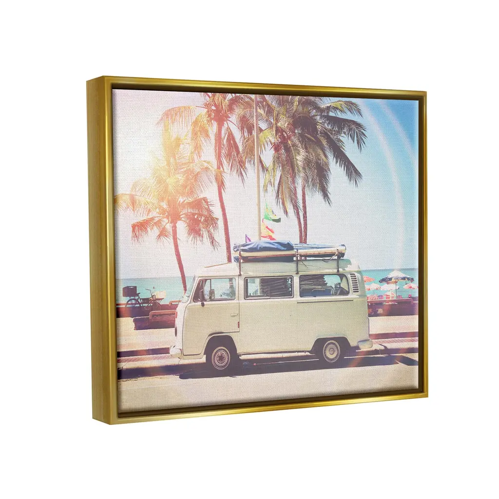 Elevate your home or office to the next level with Stupell Framed Floating Canvas Wall Art. Our premium hand-stretched canvas is mounted securely into a sturdy lightweight frame. The museum-style gap between the wrapped canvas and the box frame gives the illusion of floating artwork. Stupell Wall Art is made in the USA.Features: Dimensions: 21 x 1.7 x 17 Frame, 20 x 1.5 x 16 Canvas ArtFloating Frame Sizes Include Standard: 21 x 1.7 x 17 Oversized: 31 x 1.7 x 25Wall Art is Ready to Hang with Hardware Free Hanging. No installation required. For Easy Set Up Lean or Layer Artwork on Shelf or Against Wall.Our elevated 1.7" Thick Floating Frame is the perfect complement to our canvas style Wall Art. We use only the highest quality inks in house with industry leading printing solutions. Canvas is hand stretched over a durable wood foundation and then mounted securly into a Modern Box Frame. Made in the USA.Artwork Relates To: Car, Transportation, Vehicle, Bicycle, Van, Caravan, Vacation, Beach, Palm Tree, ShoreDesign by Sisi and Seb