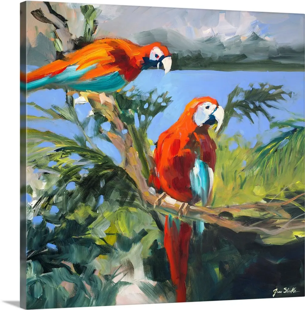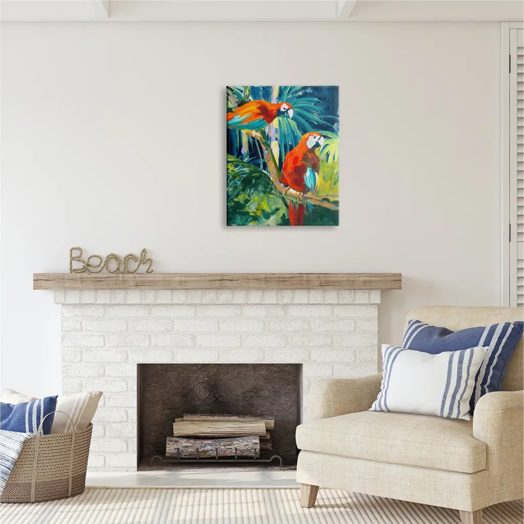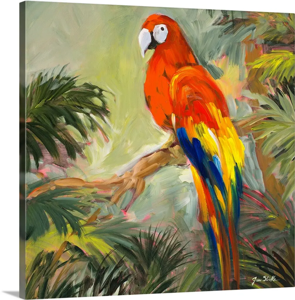 We create our stretched canvas to the highest standards. Using only the highest quality inks and canvas on Mimaki printers, we hand-cut and stretch each piece over a 1.5-inch thick wooden frame for hanging. As a result, the art comes ready to hang on the sturdy ledge with no installation required. Stupell Wall Art is made in the USA.Features: Dimensions: 16 x 1.5 x 20 InchesStretched Canvas Sizes Include Standard: 16 x 1.5 x 20 Large: 20 x 1.5 x 30 X-Large: 30 x 1.5 x 40 Oversized: 36 x 1.5 x 48Wall Art is Ready to Hang with Hardware Free Hanging. No installation required. For Easy Set Up Lean or Layer Artwork on Shelf or Against Wall.Our stretched canvas is created with the highest standards. We use only the highest quality inks and canvas on our in house Mimaki printers, and then hand cut and stretch each piece over a 1.5 inch thick wooden frame for hanging. Made In USA.Artwork Relates To: Animal, Bird, Painting, Person, Parrot, Macaw, JungleDesign by Jane Slivka
