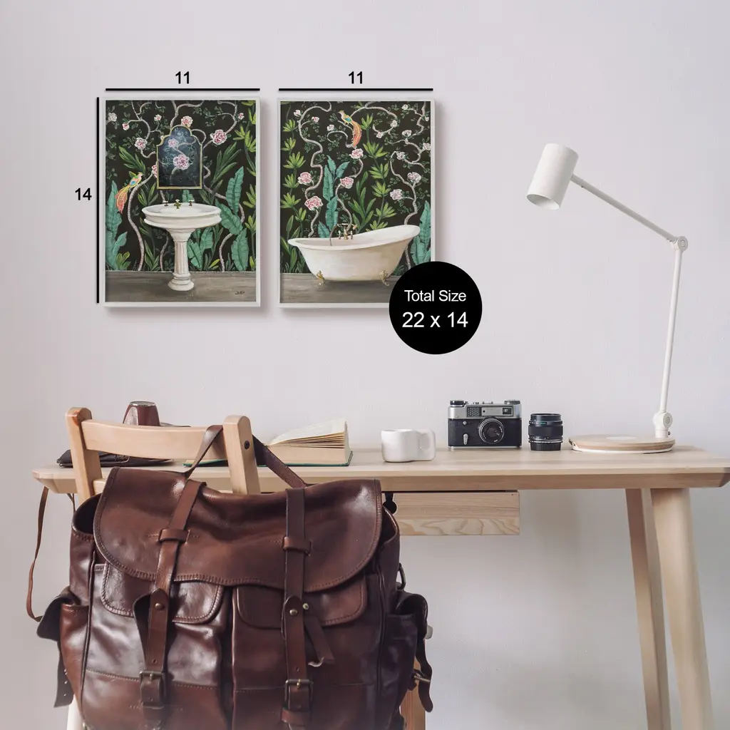 Fill any space in your home or office with our Framed Wall Art Sets. Our framed artwork is securely mounted into a 1.5-inch thick wood grain frame and ready to hang. Frames are available in three alluring styles: black, gray farmhouse and white. Stupell Wall Art is made in the USA.Features: Dimensions: 2 Piece Set, Each Panel is 11 x 1.5 x 14 FramedFramed Giclee Set Sizes Include Standard: 2pc, Each is 11 x 1.5 x 14 Large: 2pc, Each is 16 x 1.5 x 20 Oversized: 2pc, Each is 24 x 1.5 x 30Wall Art is Ready to Hang with Hardware Free Hanging. No installation required. For Easy Set Up Lean or Layer Artwork on Shelf or Against Wall.Curated Wall Art Sets make it easy for you complete the theme for any room. Our giclée prints are carefully mounted on a durable MDF backing, and then perfectly finished in a 1.5 inch thick woodgrain frame. Mounted frame colors include black, gray farmhouse and white. Made In USA.Artwork Relates To: Bathing, Bathtub, Tub, Sink, Sink Faucet, Painting, Bathroom, BirdDesign by Julia Purinton
