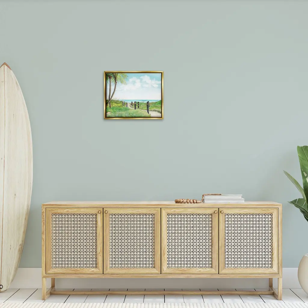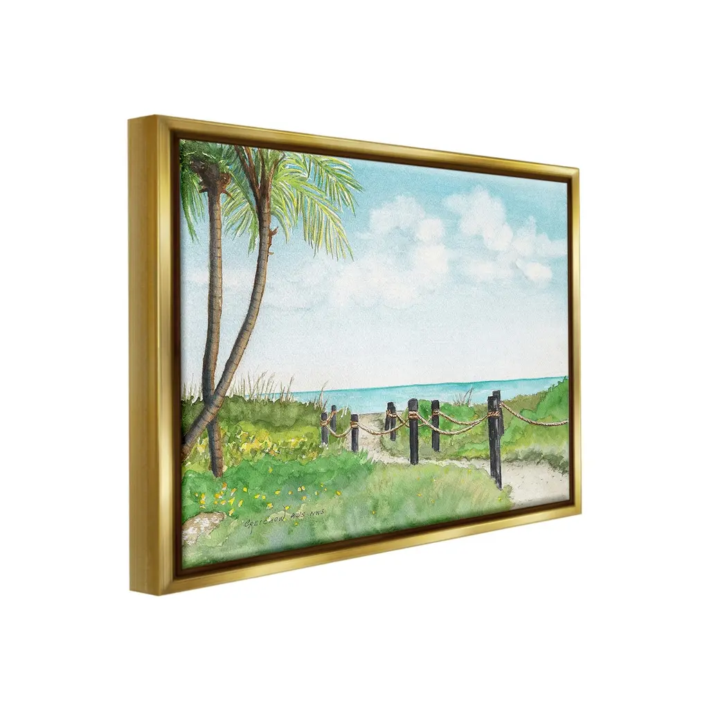 Elevate your home or office to the next level with Stupell Framed Floating Canvas Wall Art. Our premium hand-stretched canvas is mounted securely into a sturdy lightweight frame. The museum-style gap between the wrapped canvas and the box frame gives the illusion of floating artwork. Stupell Wall Art is made in the USA.Features: Dimensions: 21 x 1.7 x 17 Frame, 20 x 1.5 x 16 Canvas ArtFloating Frame Canvas Products are available in sizes 21"x17" and 31"x25". All Floating Frame Canvas Products have a 1.7" Depth.Wall Art is Ready to Hang with Hardware Free Hanging. No Installation required. For Easy Set Up Lean or Layer Artwork on Shelf or Against Wall. Artwork is Permently Fixed into the Frame.Our elevated 1.7" Thick Floating Frame is the perfect complement to our canvas style Wall Art. We use only the highest quality inks in house with industry leading printing solutions. Canvas is hand stretched over a durable wood foundation and then mounted securly into a Modern Box Frame. Made in the USA.Artwork Relates To: Summer, Nature, Scenery, Sea, Water, Shoreline, Path, Beach, Coast, Palm Tree, TropicalDesign by Christine Reichow