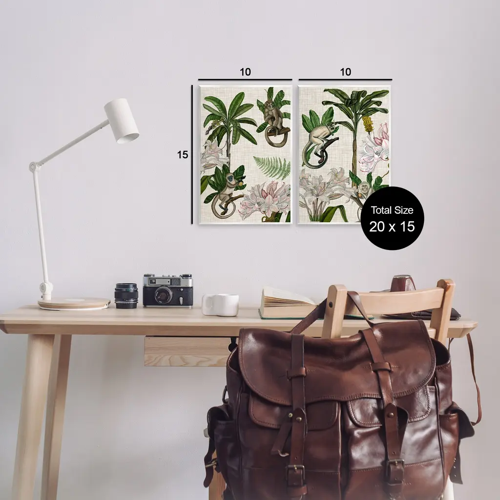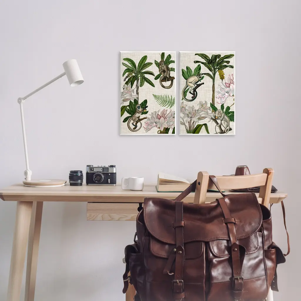Fill any space with Stupell Wall Art Sets. Our wall plaques start as high-quality lithograph prints mounted on durable 0.5-inch thick MDF wood. Each piece is hand finished and comes with a fresh layer of white foil on the sides to give it a crisp, clean look. Plaques arrive ready to hang without installation and come with removable plastic corners to keep them from damage in transit. Stupell Wall Art is made in the USA.Features: Dimensions: 2 Piece Set, Each Panel is 10 x 0.5 x 15 InchesTwo Piece Wall Plaque Sets are available as 10"x15" or 13"x19" Panels. All Wall Art Plaques have a 0.5" Depth.Wall Art is Ready to Hang with Hardware Free Hanging. No installation required. For Easy Set Up Lean or Layer Artwork on Shelf or Against Wall.All of our wall plaques start off as high quality lithograph prints that are then mounted on durable 0.5 inch thick MDF wood. Each piece is hand finished and comes with a fresh layer of foil on the sides to give it a crisp clean look. Made In USA.Artwork Relates To: Tropical, Palm Tree, Animal, Wildlife, Monkey, PlantDesign by Naomi McCavitt