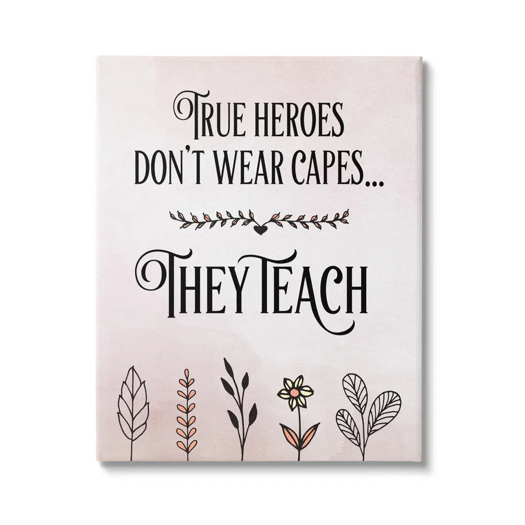 We create our stretched canvas to the highest standards. Using only the highest quality inks and canvas on Mimaki printers, we hand-cut and stretch each piece over a 1.5-inch thick wooden frame for hanging. As a result, the art comes ready to hang on the sturdy ledge with no installation required. Stupell Wall Art is made in the USA.Features: Dimensions: 16 x 1.5 x 20 InchesStretched Canvas Sizes Include Standard: 16 x 1.5 x 20 Large: 20 x 1.5 x 30 X-Large: 30 x 1.5 x 40 Oversized: 36 x 1.5 x 48Wall Art is Ready to Hang - No Installation or Hardware Needed. For Easy Set Up Lean or Layer Artwork on Shelf or Against Wall.Our stretched canvas is created with the highest standards. We use only the highest quality inks and canvas on our in house Mimaki printers, and then hand cut and stretch each piece over a 1.5 inch thick wooden frame for hanging. Made In USA.Artwork Relates To: Inspirational, Motivational, Phrase, Classroom, Teacher, Floral, Flower, Botanical, True Heroes Don't Wear Capes They TeachDesign by Tara Moss