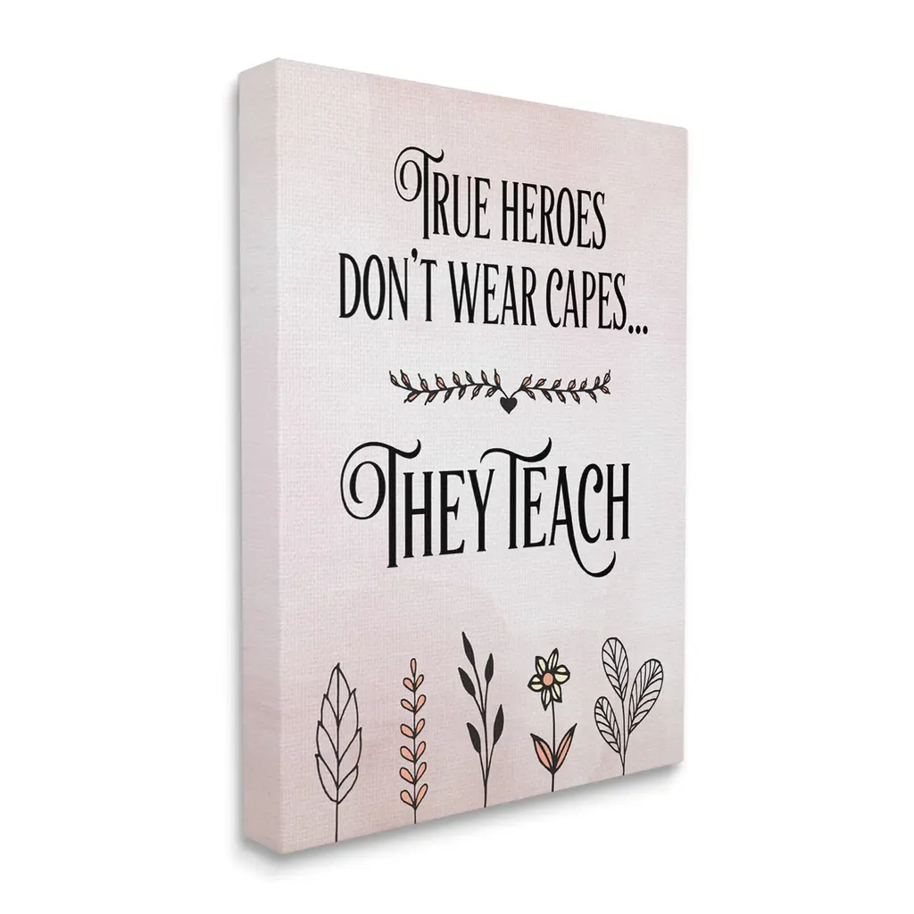 We create our stretched canvas to the highest standards. Using only the highest quality inks and canvas on Mimaki printers, we hand-cut and stretch each piece over a 1.5-inch thick wooden frame for hanging. As a result, the art comes ready to hang on the sturdy ledge with no installation required. Stupell Wall Art is made in the USA.Features: Dimensions: 16 x 1.5 x 20 InchesStretched Canvas Sizes Include Standard: 16 x 1.5 x 20 Large: 20 x 1.5 x 30 X-Large: 30 x 1.5 x 40 Oversized: 36 x 1.5 x 48Wall Art is Ready to Hang - No Installation or Hardware Needed. For Easy Set Up Lean or Layer Artwork on Shelf or Against Wall.Our stretched canvas is created with the highest standards. We use only the highest quality inks and canvas on our in house Mimaki printers, and then hand cut and stretch each piece over a 1.5 inch thick wooden frame for hanging. Made In USA.Artwork Relates To: Inspirational, Motivational, Phrase, Classroom, Teacher, Floral, Flower, Botanical, True Heroes Don't Wear Capes They TeachDesign by Tara Moss