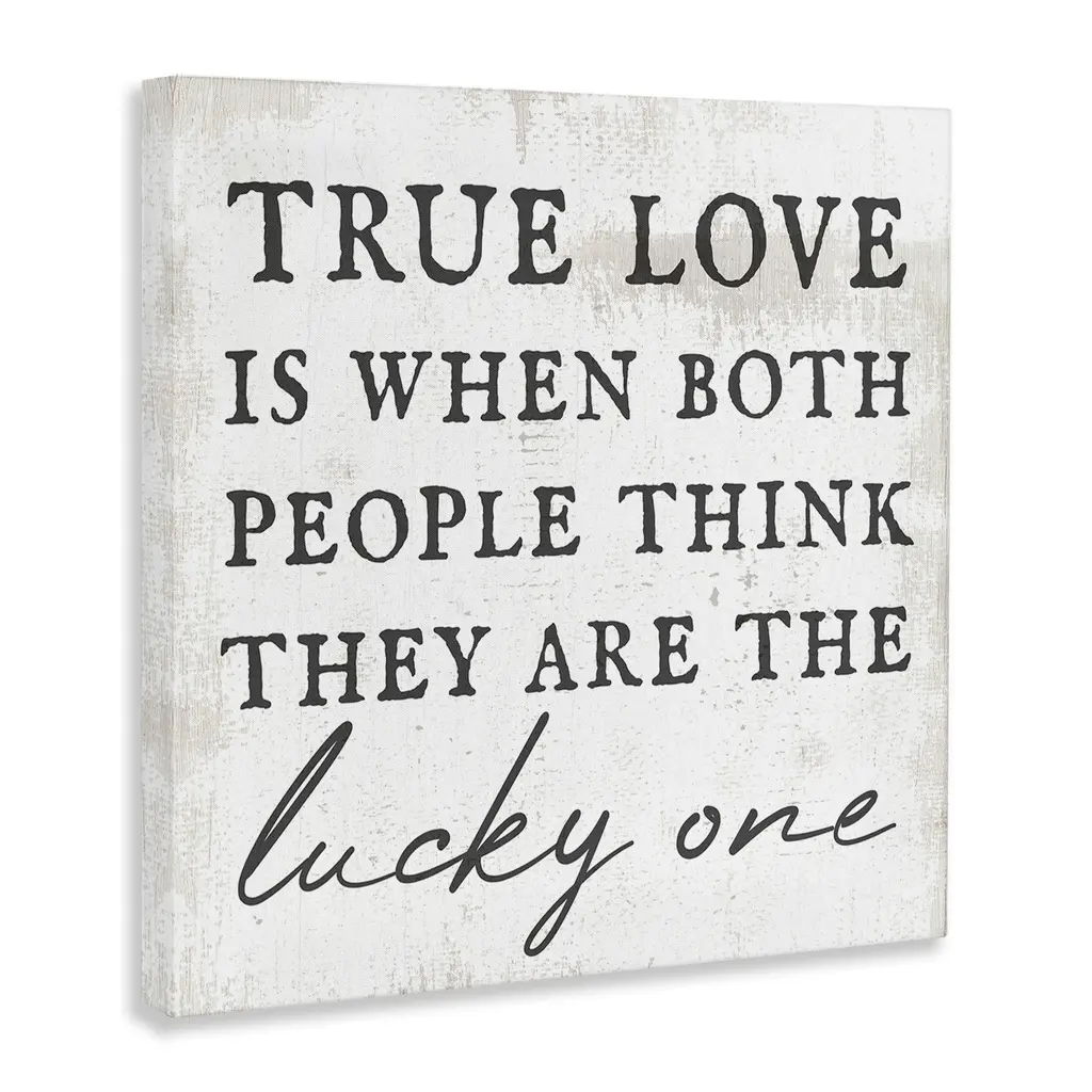 Proudly made in the USA, Our stretched canvas is created with the highest standards. We use only the highest quality inks and canvas on our in house Mimaki printers, and then hand cut and stretch each piece over a 1.5 inch thick wooden frame for hanging. The art comes ready to hang with no installation required.Features: Dimensions: 17 x 1.5 x 17 InchesStretched Canvas Sizes Include Standard: 17 x 1.5 x 17 Large: 24 x 1.5 x 24 X-Large: 30 x 1.5 x 30 Oversized: 36 x 1.5 x 36Wall Art is Ready to Hang - No Installation or Hardware Needed. For Easy Set Up Lean or Layer Artwork on Shelf or Against Wall.Our stretched canvas is created with the highest standards. We use only the highest quality inks and canvas on our in house Mimaki printers, and then hand cut and stretch each piece over a 1.5 inch thick wooden frame for hanging. Made In USA.Artwork Relates To: Rustic, Grain Pattern, Romance, LoveDesign by Daphne PolselliLiving Room, Den, Hallway, Office, Entryway, Study, Dining Room or Bed Room.Text Includes: True Love Is When Both People Think They Are The Lucky One