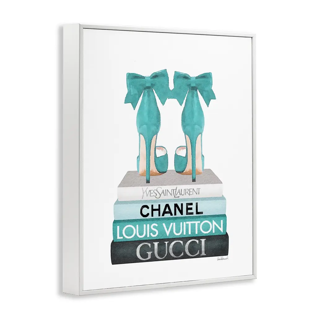Stupell Turquoise Bow Heels On Books Women's Fashion Framed Giclee Texturized Art By Amanda Greenwood - 11 X 14 - White