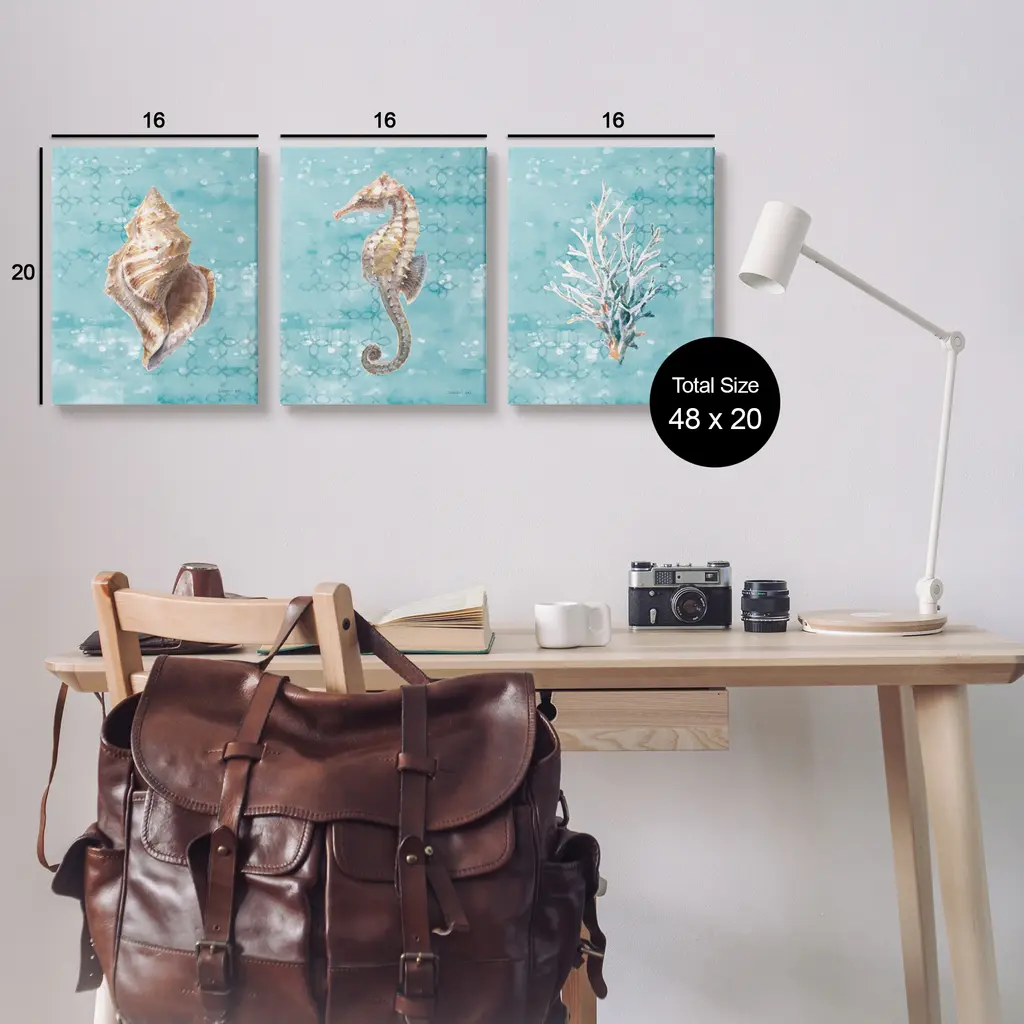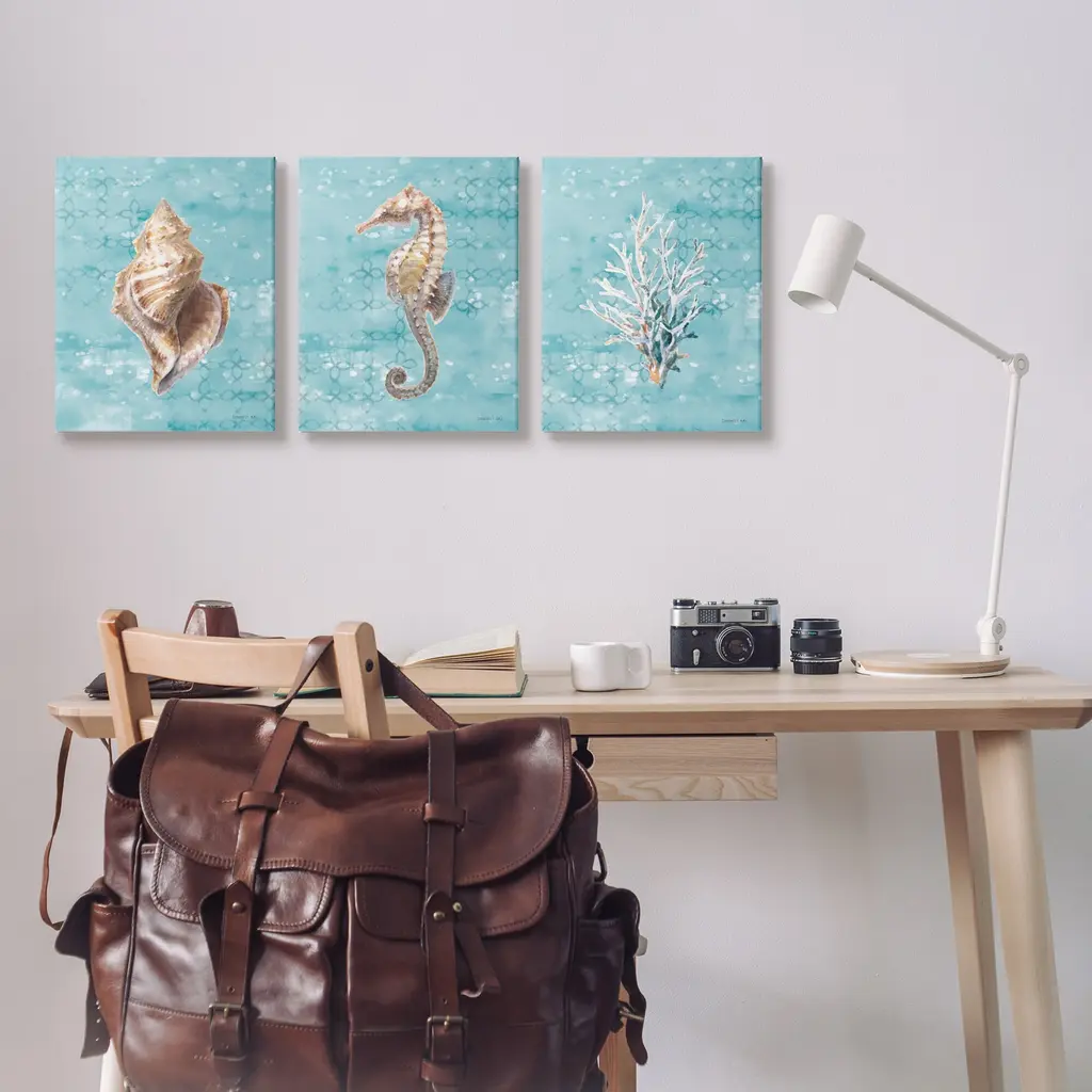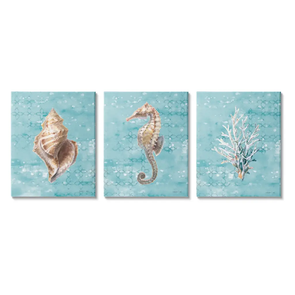 Fill any space with Stupell Wall Art Sets. We create our stretched canvas to the highest standards. Using only the highest quality inks and canvas on Mimaki printers, we hand-cut and stretch each piece over a 1.5-inch thick wooden frame for hanging. As a result, the art comes ready to hang on the sturdy ledge with no installation required. Stupell Wall Art is made in the USA.Features: Dimensions: 3 Piece Set, Each Panel is 11 x 1.5 x 14 InchesThree Piece Canvas Set Sizes Include Standard: 3pc, Each is 11 x 1.5 x 14 Large: 3pc, Each is 16 x 1.5 x 20 Oversized: 3pc, Each is 24 x 1.5 x 30Wall Art is Ready to Hang with Hardware Free Hanging. No installation required. For Easy Set Up Lean or Layer Artwork on Shelf or Against Wall.Our stretched canvas is created with the highest standards. We use only the highest quality inks and canvas on our in house Mimaki printers, and then hand cut and stretch each piece over a 1.5 inch thick wooden frame for hanging. Made In USA.Artwork Relates To: Animal, Sea Life, Invertebrate, Seashell, Plant, Conch, Seahorse, TurquoiseDesign by Danhui Nai