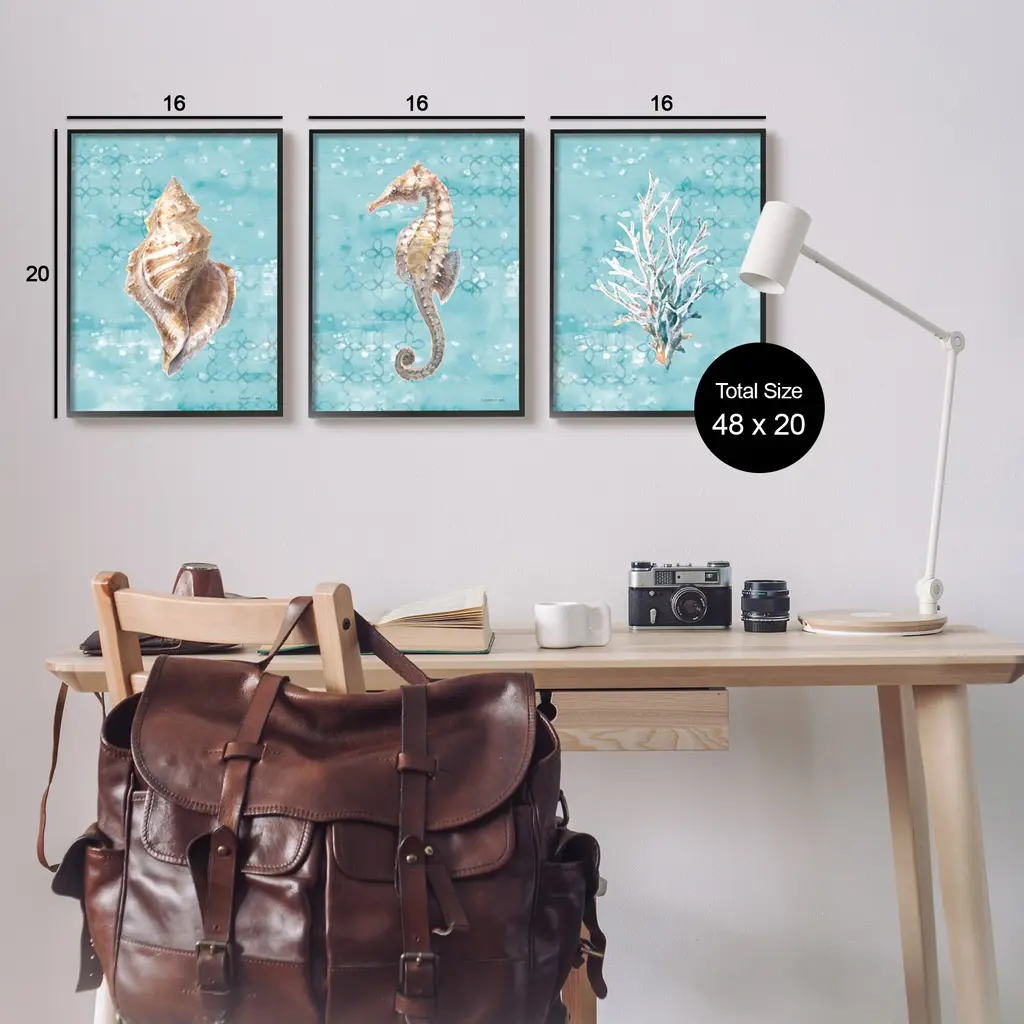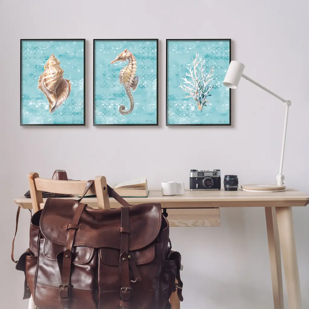 Fill any space in your home or office with our Framed Wall Art Sets. Our framed artwork is securely mounted into a 1.5-inch thick wood grain frame and ready to hang. Frames are available in three alluring styles: black, gray farmhouse and white. Stupell Wall Art is made in the USA.Features: Dimensions: 3 Piece Set, Each Panel is 11 x 1.5 x 14 FramedFramed Giclee Set Sizes Include Standard: 3pc, Each is 11 x 1.5 x 14 Large: 3pc, Each is 16 x 1.5 x 20 Oversized: 3pc, Each is 24 x 1.5 x 30Wall Art is Ready to Hang with Hardware Free Hanging. No installation required. For Easy Set Up Lean or Layer Artwork on Shelf or Against Wall.Curated Wall Art Sets make it easy for you complete the theme for any room. Our giclée prints are carefully mounted on a durable MDF backing, and then perfectly finished in a 1.5 inch thick woodgrain frame. Mounted frame colors include black, gray farmhouse and white. Made In USA.Artwork Relates To: Animal, Sea Life, Invertebrate, Seashell, Plant, Conch, Seahorse, TurquoiseDesign by Danhui Nai