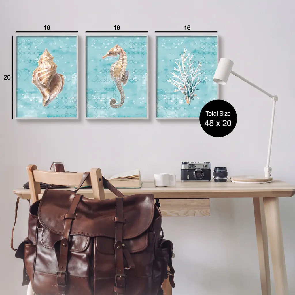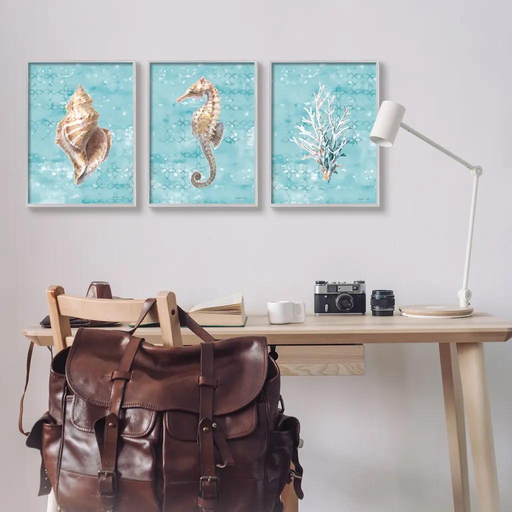 Fill any space in your home or office with our Framed Wall Art Sets. Our framed artwork is securely mounted into a 1.5-inch thick wood grain frame and ready to hang. Frames are available in three alluring styles: black, gray farmhouse and white. Stupell Wall Art is made in the USA.Features: Dimensions: 3 Piece Set, Each Panel is 11 x 1.5 x 14 FramedFramed Giclee Set Sizes Include Standard: 3pc, Each is 11 x 1.5 x 14 Large: 3pc, Each is 16 x 1.5 x 20 Oversized: 3pc, Each is 24 x 1.5 x 30Wall Art is Ready to Hang with Hardware Free Hanging. No installation required. For Easy Set Up Lean or Layer Artwork on Shelf or Against Wall.Curated Wall Art Sets make it easy for you complete the theme for any room. Our giclée prints are carefully mounted on a durable MDF backing, and then perfectly finished in a 1.5 inch thick woodgrain frame. Mounted frame colors include black, gray farmhouse and white. Made In USA.Artwork Relates To: Animal, Sea Life, Invertebrate, Seashell, Plant, Conch, Seahorse, TurquoiseDesign by Danhui Nai