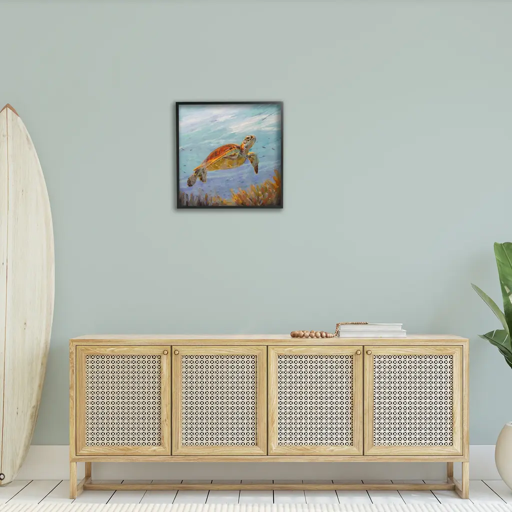 Add dimension to any room with our textured Framed Giclee Artwork. Our framed artwork is securely mounted into a 1.5-inch thick wood grain frame and ready to hang. Frames are available in three alluring styles: black, gray farmhouse and white. In addition, you should check out our oversized options if you want a statement piece. Stupell Wall Art is made in the USA.Features: Dimensions: 12 x 1.5 x 12 FramedFramed Giclee Product Sizes Include 12"x12", 17"x17", and 24"x24". Framed Giclee Products have a 1.5" Depth. Wall Art is Ready to Hang with Hardware Free Hanging. No installation required. For Easy Set Up Lean or Layer Artwork on Shelf or Against Wall.Our giclée prints are carefully mounted on a durable MDF backing, and then perfectly finished in a 1.5 inch thick woodgrain frame. Mounted frame colors include black, gray farmhouse and white. Made In USA.Artwork Relates To: Animal, Reptile, Sea Life, Sea Turtle, Turtle, Tortoise, Water, Sea, Underwater, Coral, ReefDesign by Sandy Nelson