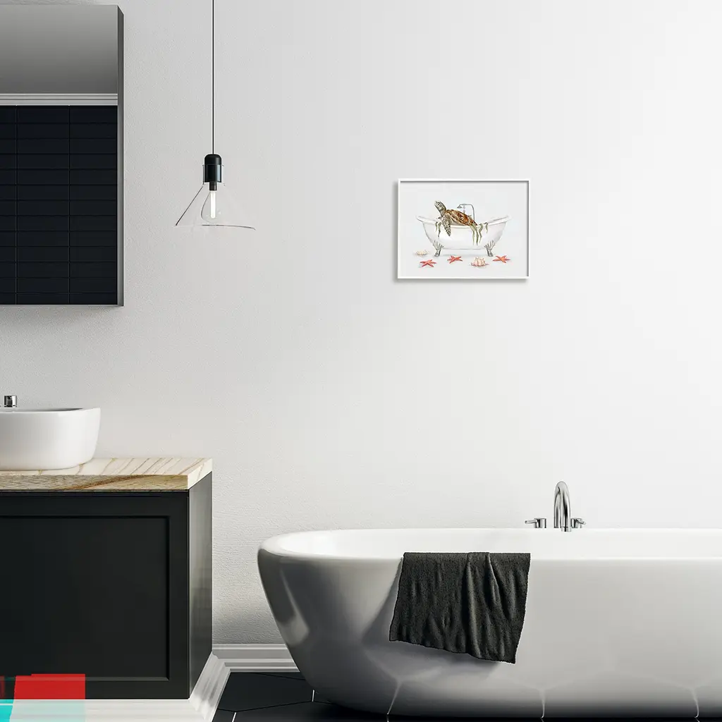 Add dimension to any room with our textured Framed Giclee Artwork. Our framed artwork is securely mounted into a 1.5-inch thick wood grain frame and ready to hang. Frames are available in three alluring styles: black, gray farmhouse and white. In addition, you should check out our oversized options if you want a statement piece. Stupell Wall Art is made in the USA.Features: Dimensions: 14 x 1.5 x 11 FramedFramed Giclee Sizes Include Standard: 14 x 1.5 x 11 Large: 20 x 1.5 x 16 Oversized: 30 x 1.5 x 24Wall Art is Ready to Hang - No Installation or Hardware Needed. For Easy Set Up Lean or Layer Artwork on Shelf or Against Wall.Our giclée prints are carefully mounted on a durable MDF backing, and then perfectly finished in a 1.5 inch thick woodgrain frame. Mounted frame colors include black, gray farmhouse and white. Made In USA.Artwork Relates To: Tub, Bathing, Bathtub, Animal, Reptile, Sea Life, Turtle, Bathroom, Seashell StarfishDesign by Ziwei Li