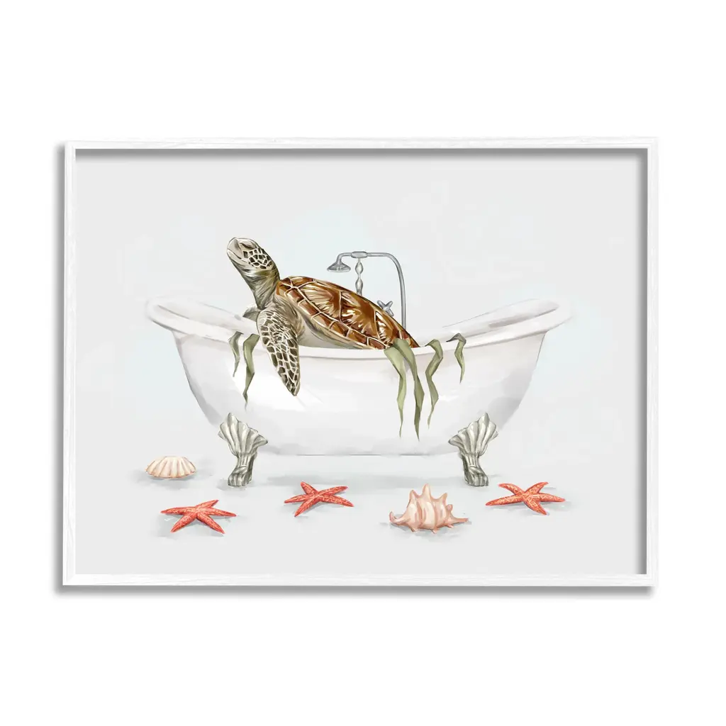 Add dimension to any room with our textured Framed Giclee Artwork. Our framed artwork is securely mounted into a 1.5-inch thick wood grain frame and ready to hang. Frames are available in three alluring styles: black, gray farmhouse and white. In addition, you should check out our oversized options if you want a statement piece. Stupell Wall Art is made in the USA.Features: Dimensions: 14 x 1.5 x 11 FramedFramed Giclee Sizes Include Standard: 14 x 1.5 x 11 Large: 20 x 1.5 x 16 Oversized: 30 x 1.5 x 24Wall Art is Ready to Hang - No Installation or Hardware Needed. For Easy Set Up Lean or Layer Artwork on Shelf or Against Wall.Our giclée prints are carefully mounted on a durable MDF backing, and then perfectly finished in a 1.5 inch thick woodgrain frame. Mounted frame colors include black, gray farmhouse and white. Made In USA.Artwork Relates To: Tub, Bathing, Bathtub, Animal, Reptile, Sea Life, Turtle, Bathroom, Seashell StarfishDesign by Ziwei Li