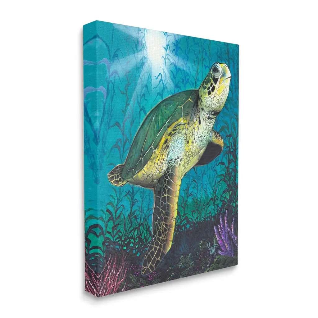 We create our stretched canvas to the highest standards. Using only the highest quality inks and canvas on Mimaki printers, we hand-cut and stretch each piece over a 1.5-inch thick wooden frame for hanging. As a result, the art comes ready to hang on the sturdy ledge with no installation required. Stupell Wall Art is made in the USA.Features: Dimensions: 16 x 1.5 x 20 InchesStretched Canvas Sizes Include Standard: 16 x 1.5 x 20 Large: 20 x 1.5 x 30 X-Large: 30 x 1.5 x 40 Oversized: 36 x 1.5 x 48Wall Art is Ready to Hang with Hardware Free Hanging. No installation required. For Easy Set Up Lean or Layer Artwork on Shelf or Against Wall.Our stretched canvas is created with the highest standards. We use only the highest quality inks and canvas on our in house Mimaki printers, and then hand cut and stretch each piece over a 1.5 inch thick wooden frame for hanging. Made In USA.Artwork Relates To: Animal, Reptile, Sea Life, Turtle, Sea Turtle, Tortoise, Nature, Water, Sea, Reef, Aquatic, Underwater, Coral, ReefDesign by Scott Westmoreland