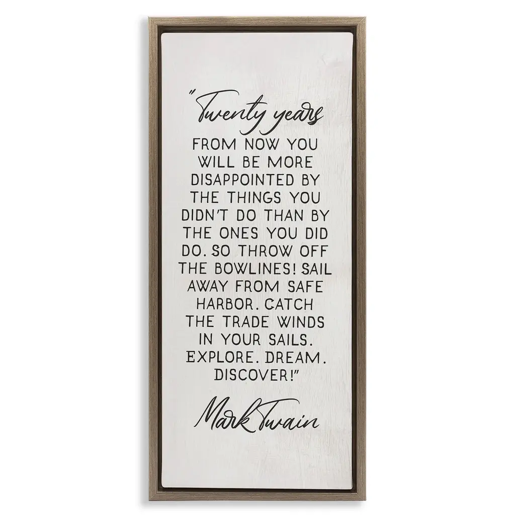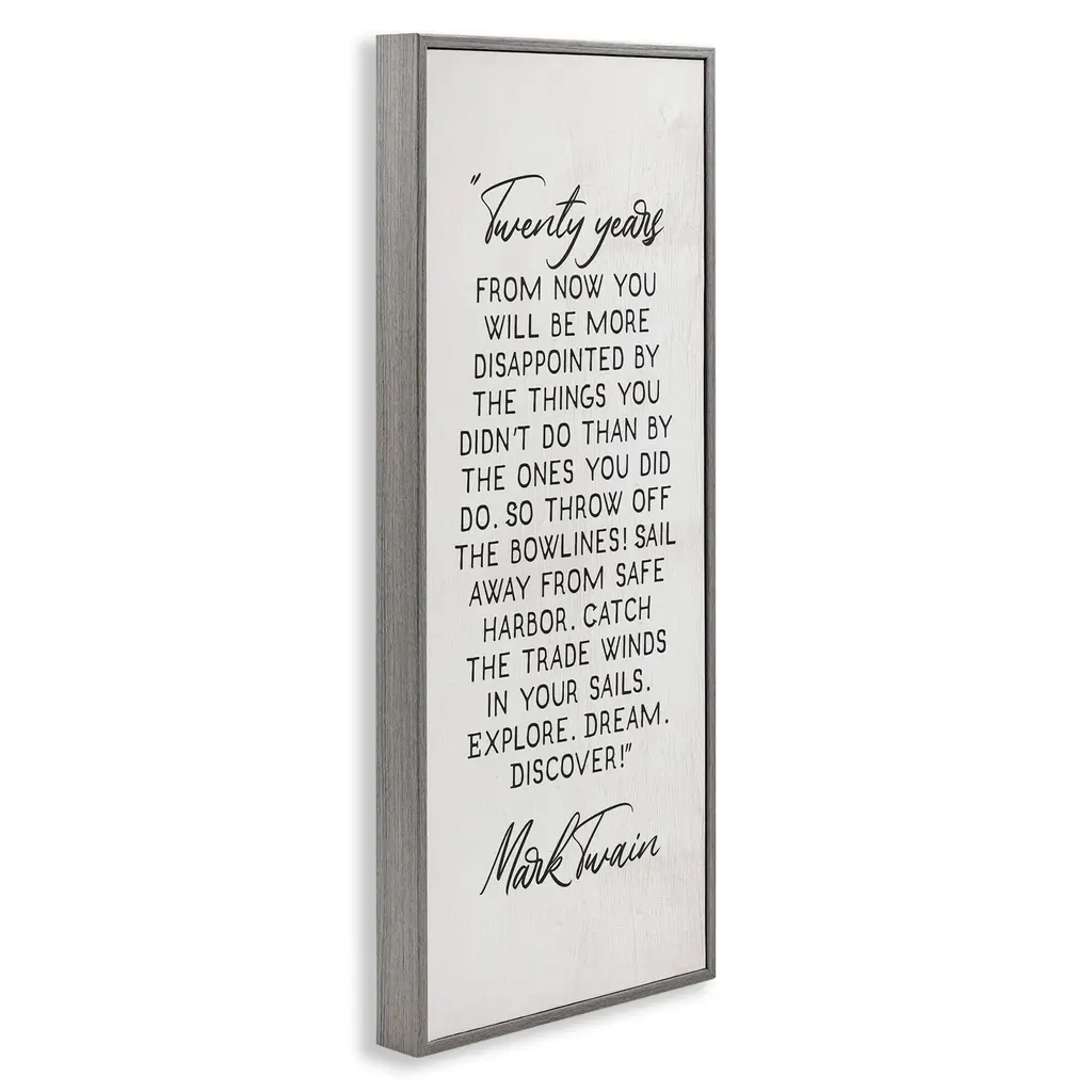 Add dimension to any room with our textured Framed Giclee Artwork. Our framed artwork is securely mounted into a 1.5-inch thick wood grain frame and ready to hang. Frames are available in three alluring styles: black, gray farmhouse and white. In addition, you should check out our oversized options if you want a statement piece. Stupell Wall Art is made in the USA.Features: Dimensions: 10 x 1.5 x 24 FramedFramed Giclee Product Sizes include 10"x24" and 13"x30". All Framed Giclee products have a 1.5" Depth.Wall Art is Ready to Hang with Hardware Free Hanging. No installation required. For Easy Set Up Lean or Layer Artwork on Shelf or Against Wall.Our giclée prints are carefully mounted on a durable MDF backing, and then perfectly finished in a 1.5 inch thick woodgrain frame. Mounted frame colors include black, gray farmhouse and white. Made In USA.Artwork Relates To: Quote, Motivational, Inspirational, Mark Twain, LiteratureDesign by Daphne Polselli