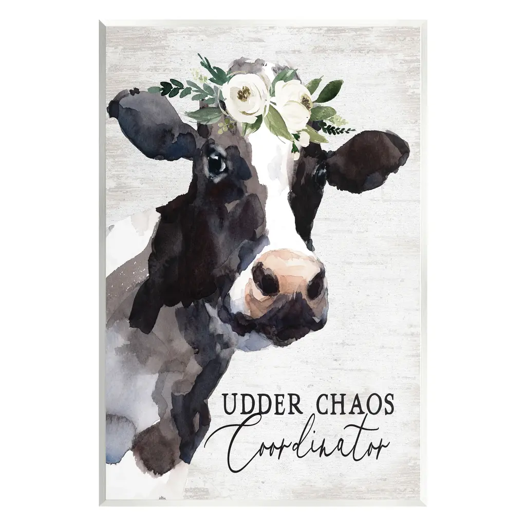 Our wall plaques start as high-quality lithograph prints mounted on durable 0.5-inch thick MDF wood. Each piece is hand finished and comes with a fresh layer of white foil on the sides to give it a crisp, clean look. Plaques arrive ready to hang without installation and come with removable plastic corners to keep them from damage in transit. Stupell Wall Art is made in the USA.Features: Dimensions: 10 x 0.5 x 15 InchesWall Plaque Sizes Include Standard: 10 x 0.5 x 15 Oversized: 13 x 0.5 x 19Wall Art is Ready to Hang with Hardware Free Hanging. No installation required. For Easy Set Up Lean or Layer Artwork on Shelf or Against Wall.All of our wall plaques start off as high quality lithograph prints that are then mounted on durable 0.5 inch thick MDF wood. Each piece is hand finished and comes with a fresh layer of foil on the sides to give it a crisp clean look. Made In USA.Artwork Relates To: Animal, Cattle, Cow, Mammal, Flower, Plant, Rose, Farmhouse, Udder Chaos CoordinatorDesign by Lettered and Lined