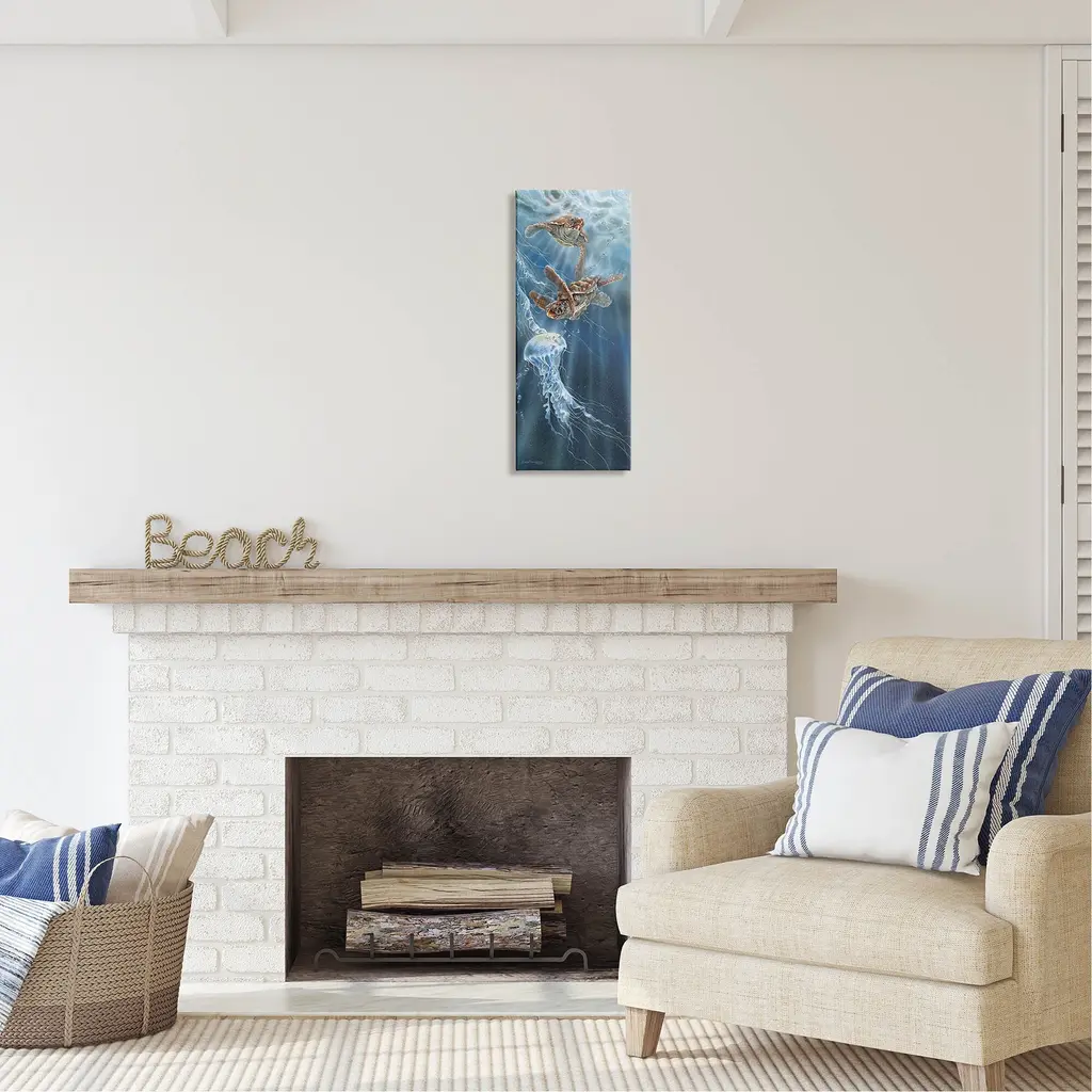 We create our stretched canvas to the highest standards. Using only the highest quality inks and canvas on Mimaki printers, we hand-cut and stretch each piece over a 1.5-inch thick wooden frame for hanging. As a result, the art comes ready to hang on the sturdy ledge with no installation required. Stupell Wall Art is made in the USA.Features: Dimensions: 10 x 1.5 x 24 InchesStretched Canvas Sizes Include Standard: 10 x 1.5 x 24 Large: 13 x 1.5 x 30 X-Large: 17 x 1.5 x 40 Oversized: 20 x 1.5 x 48Wall Art is Ready to Hang - No Installation or Hardware Needed. For Easy Set Up Lean or Layer Artwork on Shelf or Against Wall.Our stretched canvas is created with the highest standards. We use only the highest quality inks and canvas on our in house Mimaki printers, and then hand cut and stretch each piece over a 1.5 inch thick wooden frame for hanging. Made In USA.Artwork Relates To: Aquatic, Water, Animal, Reptile, Sea Life, Turtle, Nature, Wildlife, JellyfishDesign by Linda Thompson