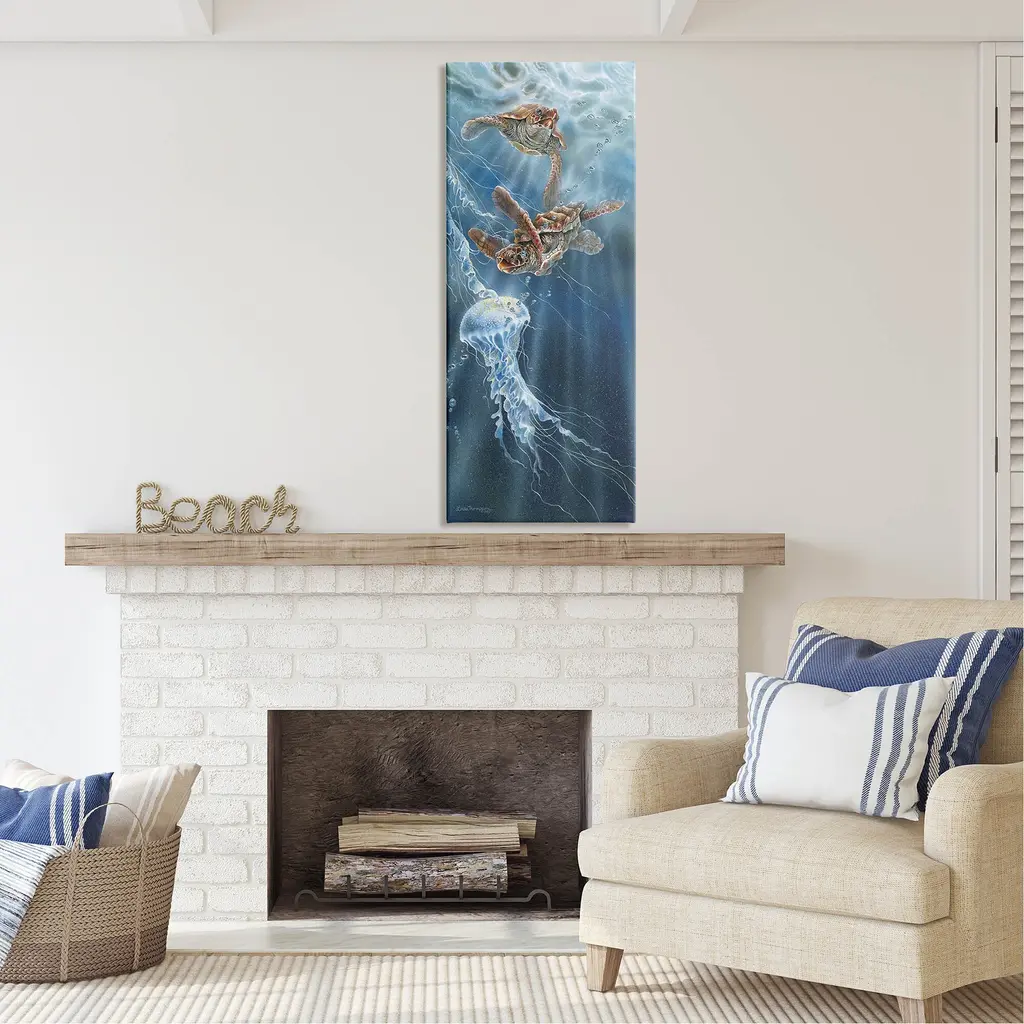 We create our stretched canvas to the highest standards. Using only the highest quality inks and canvas on Mimaki printers, we hand-cut and stretch each piece over a 1.5-inch thick wooden frame for hanging. As a result, the art comes ready to hang on the sturdy ledge with no installation required. Stupell Wall Art is made in the USA.Features: Dimensions: 10 x 1.5 x 24 InchesStretched Canvas Sizes Include Standard: 10 x 1.5 x 24 Large: 13 x 1.5 x 30 X-Large: 17 x 1.5 x 40 Oversized: 20 x 1.5 x 48Wall Art is Ready to Hang - No Installation or Hardware Needed. For Easy Set Up Lean or Layer Artwork on Shelf or Against Wall.Our stretched canvas is created with the highest standards. We use only the highest quality inks and canvas on our in house Mimaki printers, and then hand cut and stretch each piece over a 1.5 inch thick wooden frame for hanging. Made In USA.Artwork Relates To: Aquatic, Water, Animal, Reptile, Sea Life, Turtle, Nature, Wildlife, JellyfishDesign by Linda Thompson
