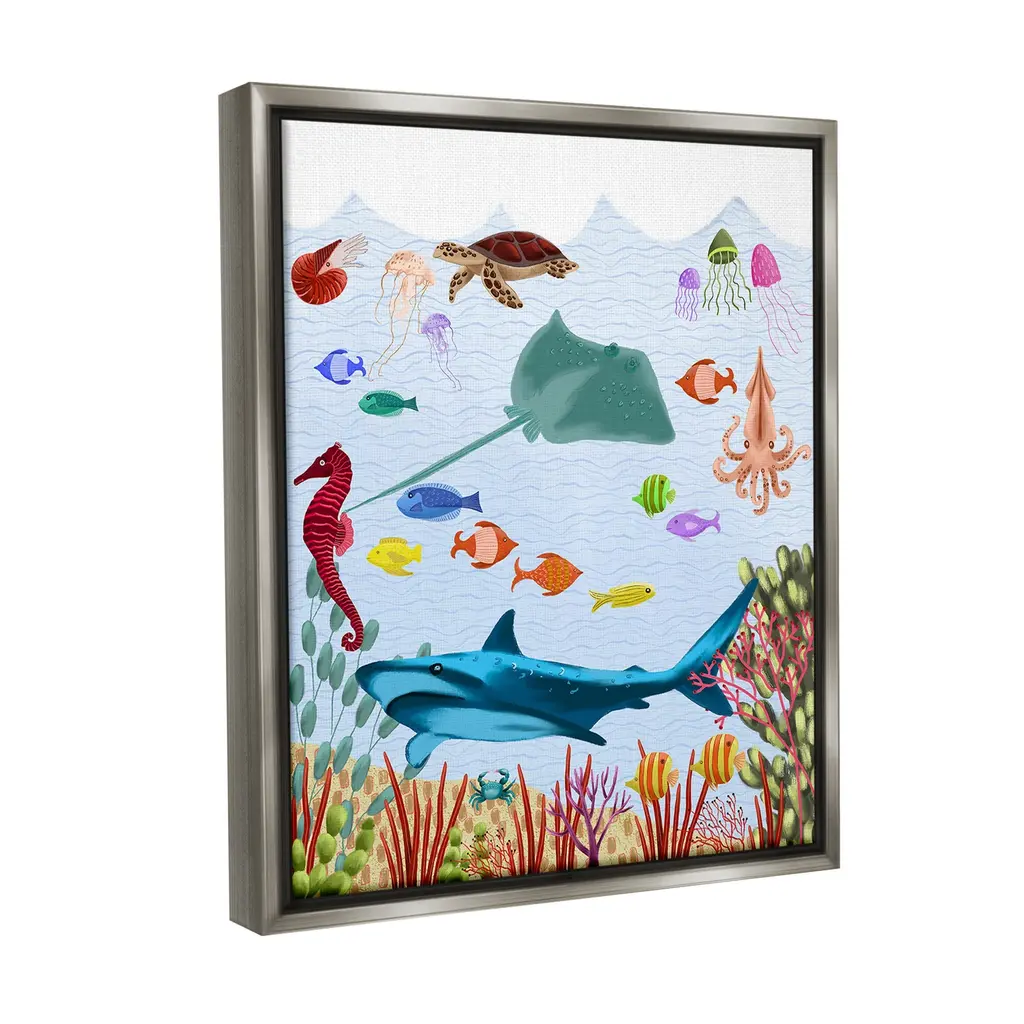 Elevate your home or office to the next level with Stupell Framed Floating Canvas Wall Art. Our premium hand-stretched canvas is mounted securely into a sturdy lightweight frame. The museum-style gap between the wrapped canvas and the box frame gives the illusion of floating artwork. Stupell Wall Art is made in the USA.Features: Dimensions: 17 x 1.7 x 21 Frame, 16 x 1.5 x 20 Canvas ArtFloating Frame Canvas Products are available in sizes 17"x21" and 25"x31". All Floating Frame Canvas Products have a 1.7" Depth.Wall Art is Ready to Hang with Hardware Free Hanging. No Installation required. For Easy Set Up Lean or Layer Artwork on Shelf or Against Wall. Artwork is Permently Fixed into the Frame.Our elevated 1.7" Thick Floating Frame is the perfect complement to our canvas style Wall Art. We use only the highest quality inks in house with industry leading printing solutions. Canvas is hand stretched over a durable wood foundation and then mounted securly into a Modern Box Frame. Made in the USA.Artwork Relates To: Animal, Sea Life, Turtle, Fish, Shark, Reef, Sea, Water, Coral Reef, Manta Ray, Nautical, Maritime, Underwater, Squid, JellyfishDesign by Regina Moore