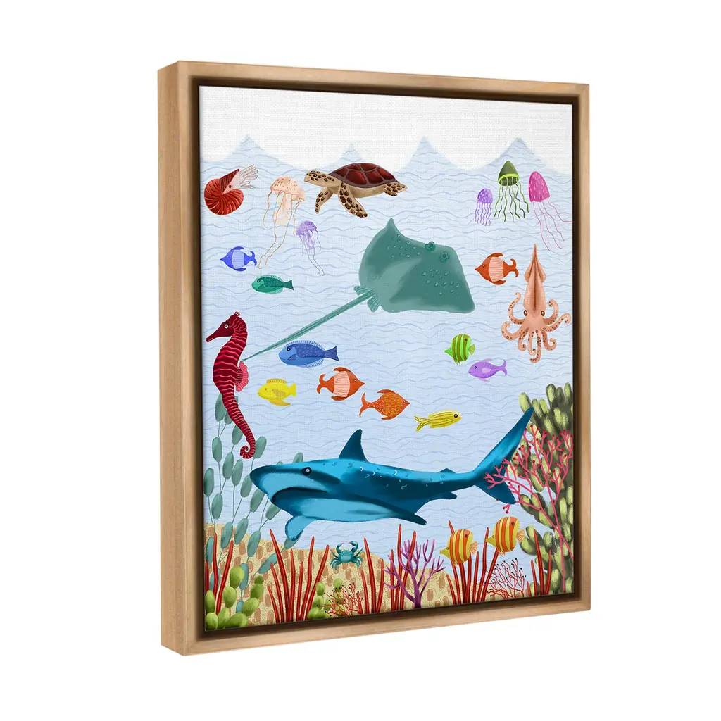 Elevate your home or office to the next level with Stupell Framed Floating Canvas Wall Art. Our premium hand-stretched canvas is mounted securely into a sturdy lightweight frame. The museum-style gap between the wrapped canvas and the box frame gives the illusion of floating artwork. Stupell Wall Art is made in the USA.Features: Dimensions: 17 x 1.7 x 21 Frame, 16 x 1.5 x 20 Canvas ArtFloating Frame Canvas Products are available in sizes 17"x21" and 25"x31". All Floating Frame Canvas Products have a 1.7" Depth.Wall Art is Ready to Hang with Hardware Free Hanging. No Installation required. For Easy Set Up Lean or Layer Artwork on Shelf or Against Wall. Artwork is Permently Fixed into the Frame.Our elevated 1.7" Thick Floating Frame is the perfect complement to our canvas style Wall Art. We use only the highest quality inks in house with industry leading printing solutions. Canvas is hand stretched over a durable wood foundation and then mounted securly into a Modern Box Frame. Made in the USA.Artwork Relates To: Animal, Sea Life, Turtle, Fish, Shark, Reef, Sea, Water, Coral Reef, Manta Ray, Nautical, Maritime, Underwater, Squid, JellyfishDesign by Regina Moore