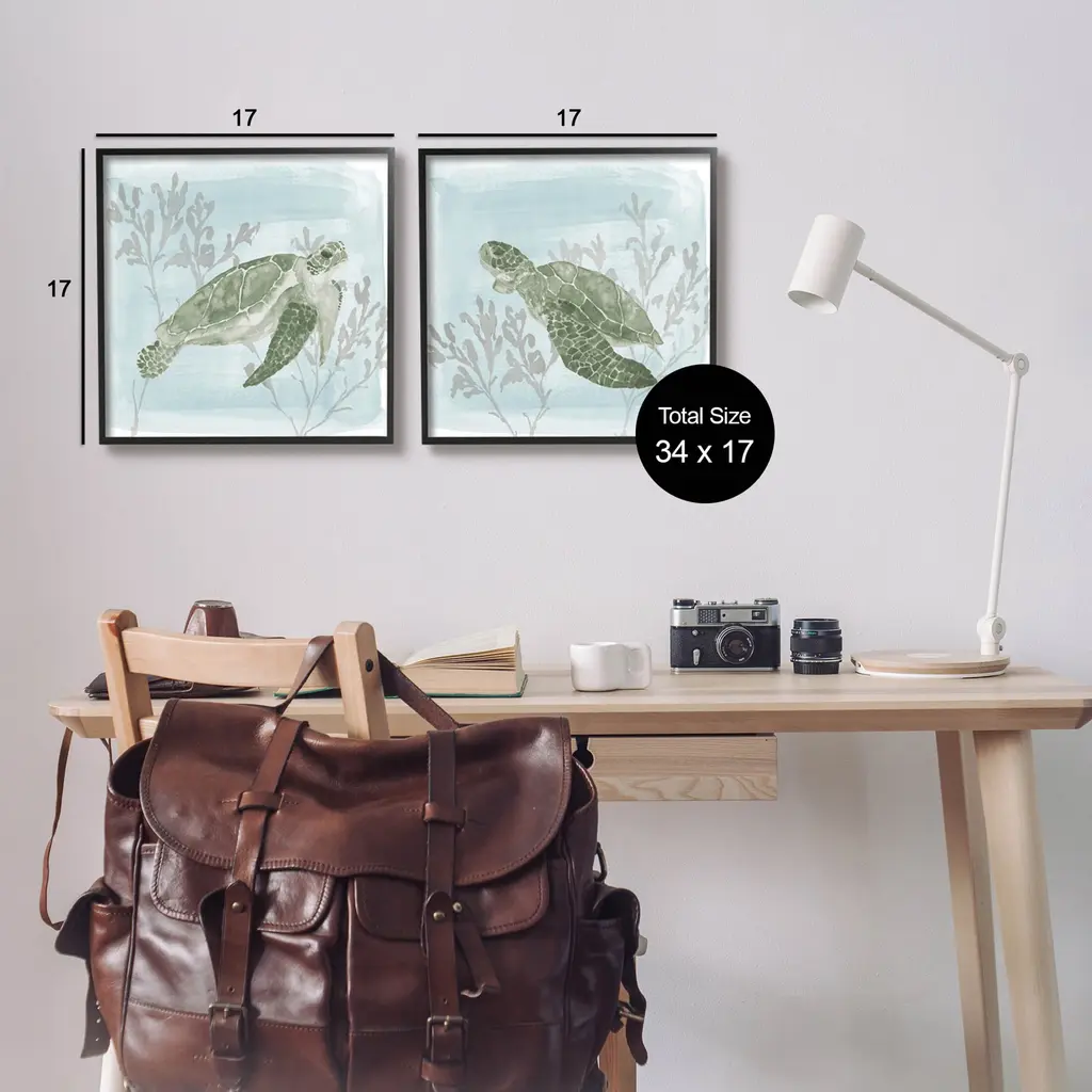 Fill any space in your home or office with our Framed Wall Art Sets. Our textured artwork will add more depth and dimension to any space. Each piece is mounted into a 1.5 inch thick ebony wood grain frame that is ready to hang. Looking for a statement piece? Our boxed framed products are now available in three alluring styles: black, gray farmhouse and white. We have oversized artwork available.Features: Dimensions: 2 Piece Set, Each Panel is 12 x 1.5 x 12 FramedFramed Giclee Set Sizes Include Standard: 2pc, Each is 12 x 1.5 x 12 Large: 2pc, Each is 17 x 1.5 x 17 Oversized: 2pc, Each is 24 x 1.5 x 24Wall Art is Ready to Hang - No Installation or Hardware Needed. For Easy Set Up Lean or Layer Artwork on Shelf or Against Wall.Curated Wall Art Sets make it easy for you complete the theme for any room. Our giclée prints are carefully mounted on a durable MDF backing, and then perfectly finished in a 1.5 inch thick woodgrain frame. Mounted frame colors include black, gray farmhouse and white. Made In USA.Artwork Relates To: Turtle, Sea Life, Animal, Reptile, Sea Turtle, Tortoise, Underwater, CoralDesign by Lucille Price