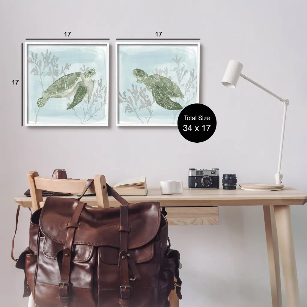 Fill any space in your home or office with our Framed Wall Art Sets. Our textured artwork will add more depth and dimension to any space. Each piece is mounted into a 1.5 inch thick ebony wood grain frame that is ready to hang. Looking for a statement piece? Our boxed framed products are now available in three alluring styles: black, gray farmhouse and white. We have oversized artwork available.Features: Dimensions: 2 Piece Set, Each Panel is 12 x 1.5 x 12 FramedFramed Giclee Set Sizes Include Standard: 2pc, Each is 12 x 1.5 x 12 Large: 2pc, Each is 17 x 1.5 x 17 Oversized: 2pc, Each is 24 x 1.5 x 24Wall Art is Ready to Hang - No Installation or Hardware Needed. For Easy Set Up Lean or Layer Artwork on Shelf or Against Wall.Curated Wall Art Sets make it easy for you complete the theme for any room. Our giclée prints are carefully mounted on a durable MDF backing, and then perfectly finished in a 1.5 inch thick woodgrain frame. Mounted frame colors include black, gray farmhouse and white. Made In USA.Artwork Relates To: Turtle, Sea Life, Animal, Reptile, Sea Turtle, Tortoise, Underwater, CoralDesign by Lucille Price