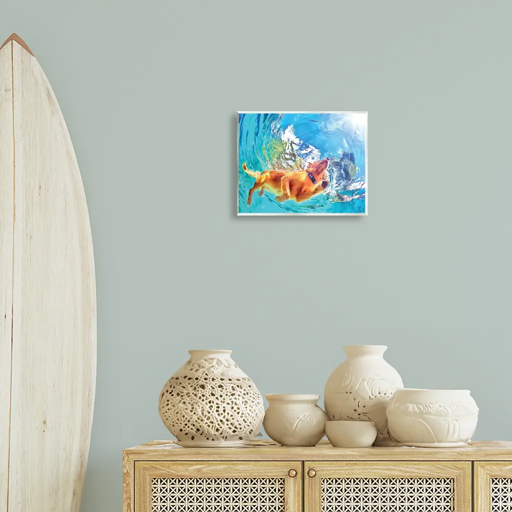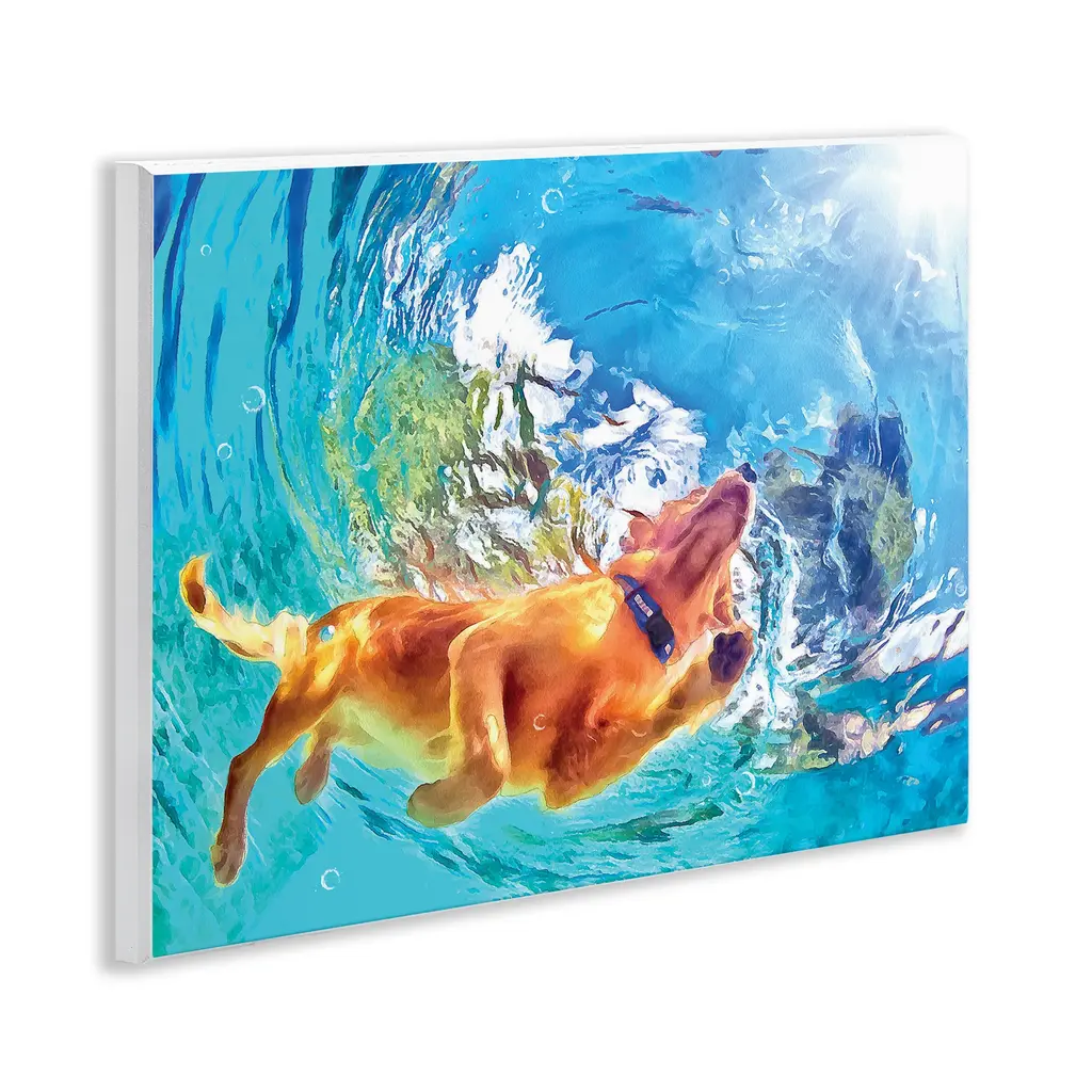Our wall plaques start as high-quality lithograph prints mounted on durable 0.5-inch thick MDF wood. Each piece is hand finished and comes with a fresh layer of white foil on the sides to give it a crisp, clean look. Plaques arrive ready to hang without installation and come with removable plastic corners to keep them from damage in transit. Stupell Wall Art is made in the USA.Features: Dimensions: 14 x 0.5 x 11 InchesWall Art is Ready to Hang with Hardware Free Hanging. No installation required. For Easy Set Up Lean or Layer Artwork on Shelf or Against Wall.All of our wall plaques start off as high quality lithograph prints that are then mounted on durable 0.5 inch thick MDF wood. Each piece is hand finished and comes with a fresh layer of foil on the sides to give it a crisp clean look. Made In USA.Artwork Relates To: Swimming, Water, Nature, Animal, Mammal, Summer, Canine, Dog, Golden Retriever, Pet, UnderwaterDesign by Masey St. Studios